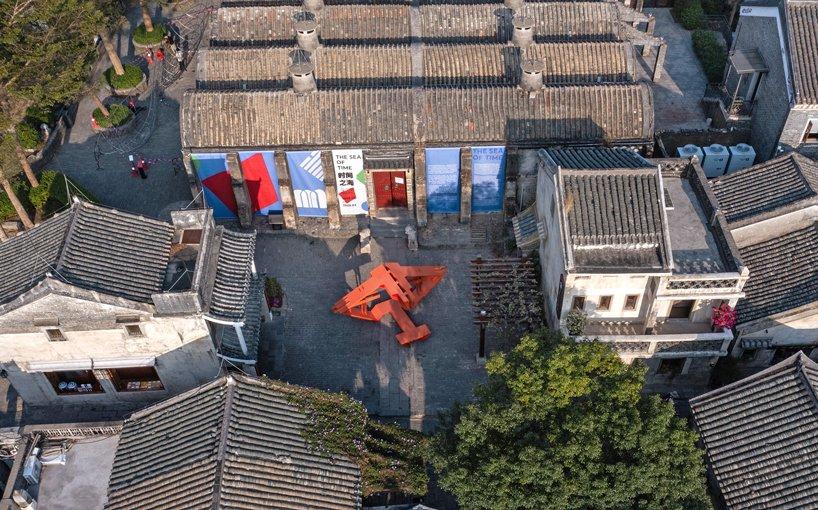 these four elements come together in a new futuristic appearance and are applied with a bright orange color to represent the work clothes of the cleaners of dapeng. the abstract structure forms a striking contrast with the historic environment and offers a completely different perspective on the local building culture. past, present and future become merged into one expression.