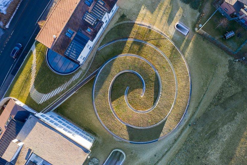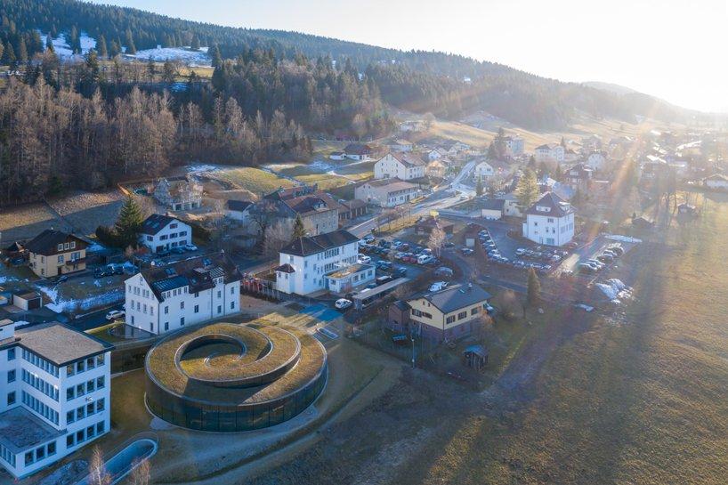 internally, the floors follow different gradients to adapt to the natural terrain and provide the basis of the museum’s inner layout stretched into a linear continuous spatial experience. the curved glass walls converge clockwise towards the spiral’s center, before moving in the opposite direction. in this way, visitors travel through the building as they would through the spring of a timepiece. ‘watchmaking like architecture is the art and science of imbuing metals and minerals with energy, movement, intelligence and measure to bring them to life in the form of telling time,’ says bjarke ingels.