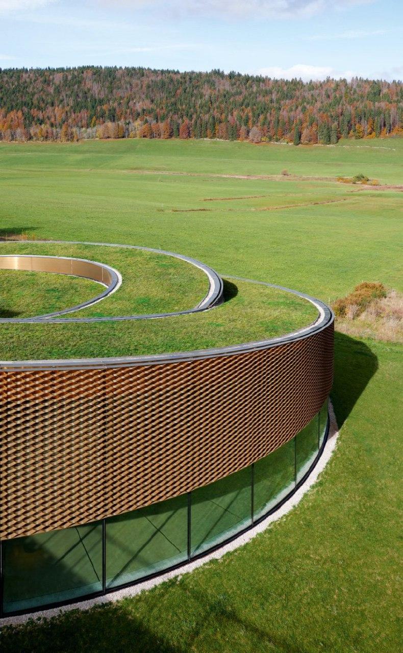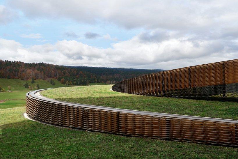 designed by BIG, who worked closely on the project with local firm CCHE as well as audemars piguet, the spiral-shaped pavilion rises on walls of structural curved glass. integrated with the landscape, the glazing entirely supports the steel roof, while a brass mesh runs along the external surface to regulate light and temperature. a green roof further helps regulate temperature, while absorbing water.