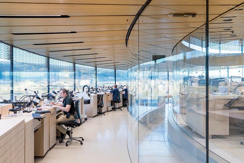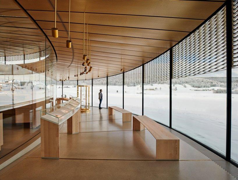 serving as both a museum and a place of work for audemars piguet’s craftspeople, the design contains traditional workshops where visitors can observe the company’s staff working on the timepieces. spanning over two centuries of history, the museum showcases more than 300 watches, including feats of complication, miniaturization, and unconventional designs.