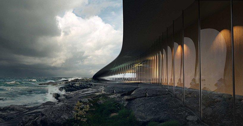 situated by the edge of the ocean, dorte mandrup’s design grows out of the region’s dramatic landscape. the unobtrusive building rises gradually with visitors and locals invited to walk on the roof. from here guests will have unspoiled views of the ocean, the mountains, the midnight sun, or even the northern lights. the curved roof is covered with stones that will naturally patinate over time, underlining the connection between the landscape and the building.
