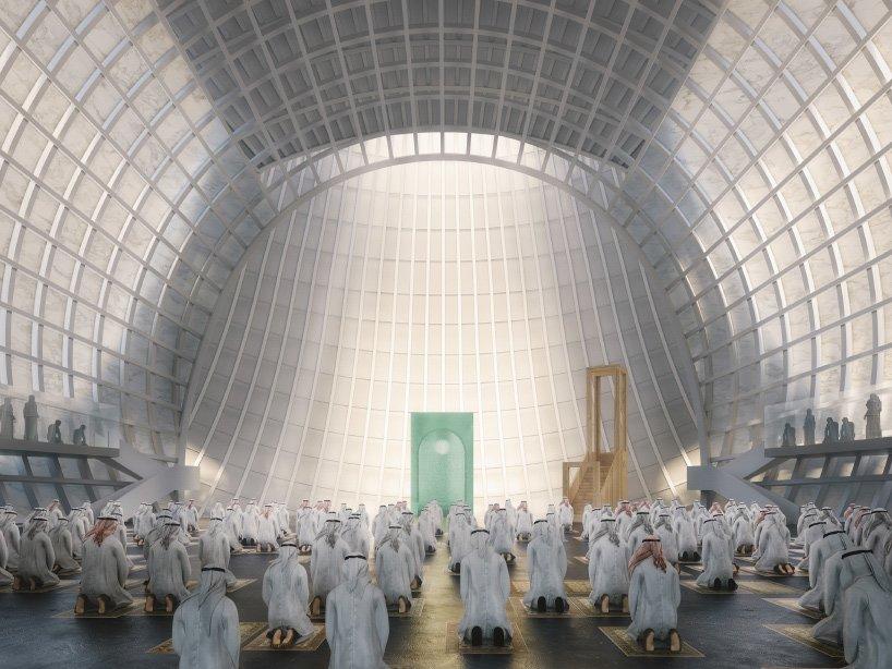 each of the three worship halls — the church, the mosque, and the synagogue — is a variation of the sphere. accessed via a shared plaza, these three volumes are set in a body of water, conceived as an oasis within the desert environment. ‘the three worship halls hover above, and reflect in the pond, giving them a sense of magical weightlessness, seeking the ephemeral,’ explains safdie architects. ‘they touch the earth lightly over their foundations, as they rise towards the heavens, shimmering in the light.’