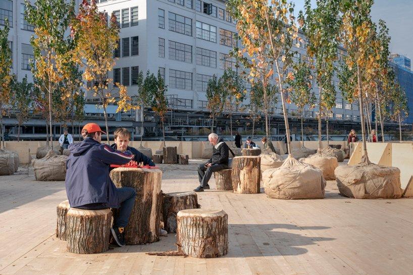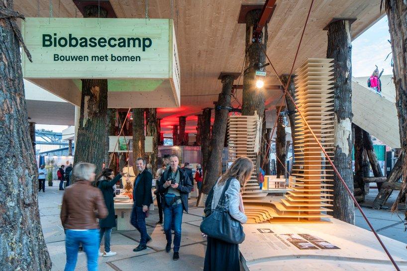 in addition to conveying the capabilities of timber, biobasecamp is also an interactive piece as it invites visitors to climb up on the roof level or explore the exhibition on the ground level that has been set up among the trees to convey the diversity and power of wood as a raw material. the exhibition also shows the historical interdependence of dutch culture with wood and forestry. the work exhibited includes ‘the dutch mountains’, ‘via parijs, a design exploration for a climate neutral netherlands’, ‘greentech incubator’, ‘visitors centre van gogh national park’, ‘peppelland observation tower’ and ‘ecoduct’.