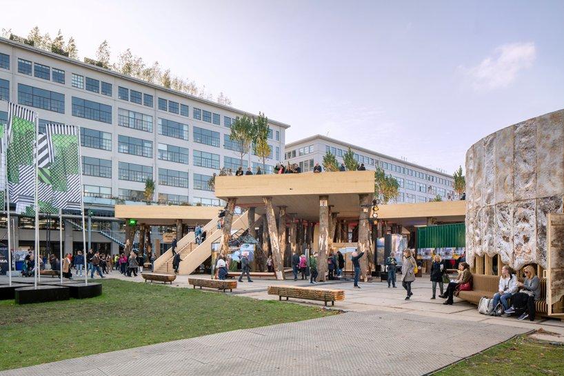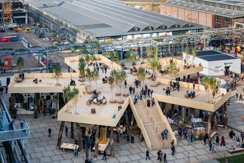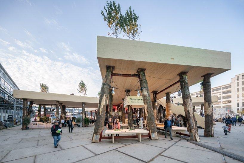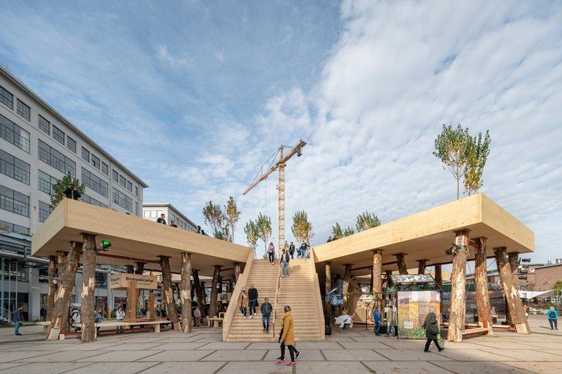 Designboom_for the occasion of dutch design week 2019, studio marco vermeulen has brought ‘the wooden revolution’ to ketelhuisplein in eindhoven with the ‘biobasecamp’ pavilion. built using timber, the project showcases the structural possibilities of the material in an effort to encourage a new era of environmentally-friendly construction.