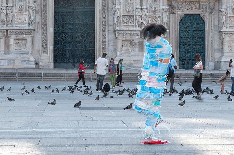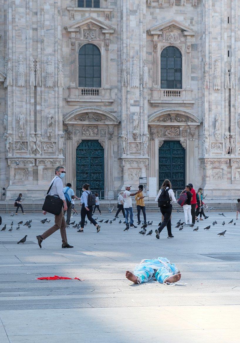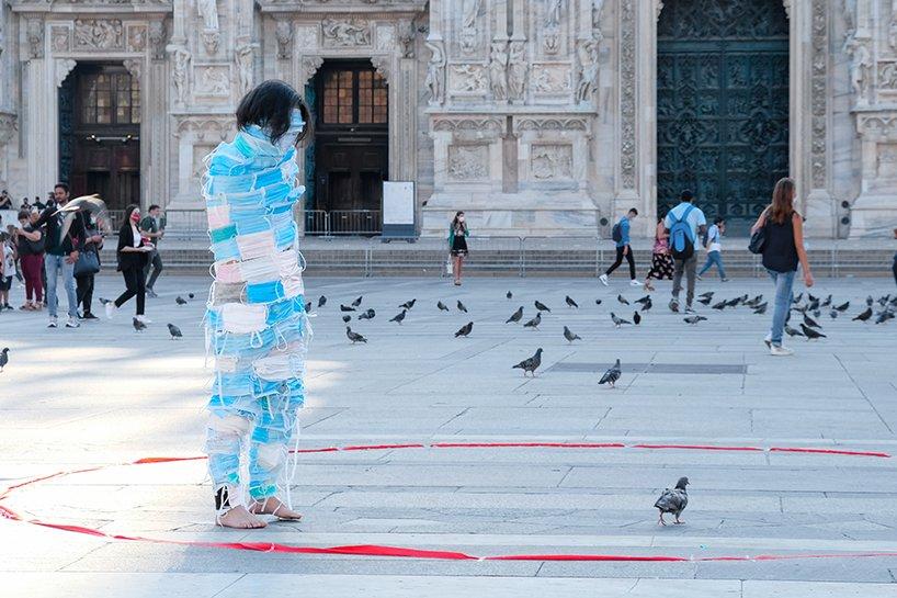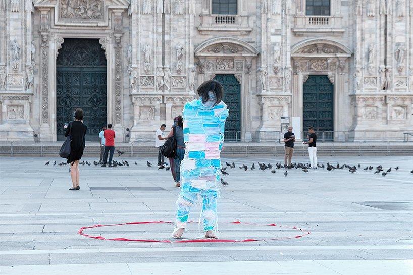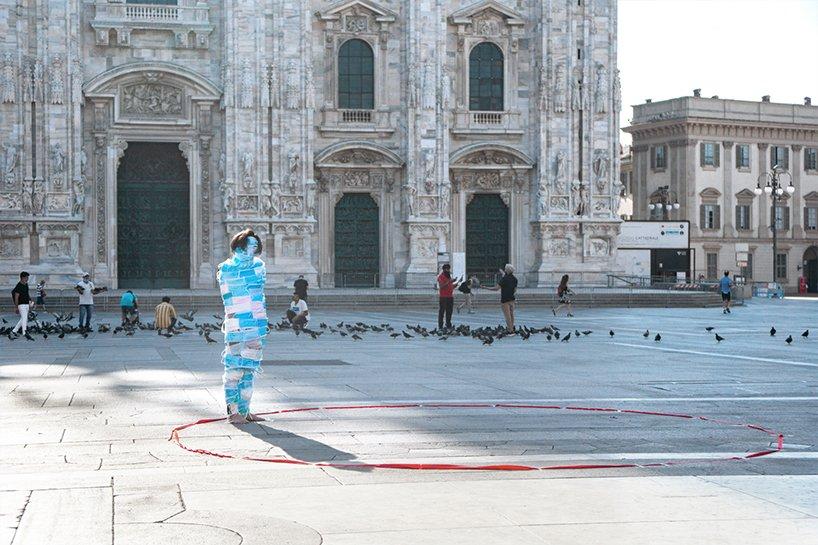 landscape architect chaosteria has collaborated with xixi zi and xuegang wang to present the ‘no escape’ public performance, aiming to address the effect of the coronavirus pandemic on humans’ everyday life and their relationship with nature. the project unravels in front of the milan cathedral, featuring a constrained man in a whole-body face mask wrap, who struggles to move within the limits of a shrinking red circle, marked on the ground.