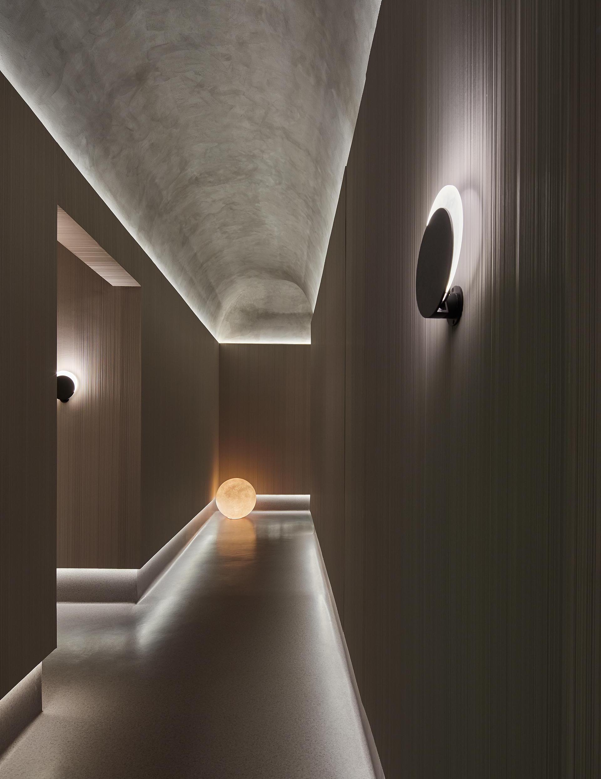 In the hallways leading to the treatment rooms, indirect lighting is included at the top of the wall where it meets the ceiling, as well as the bottom, where the light reflects off the floor, creating a pleasing ambient glow.