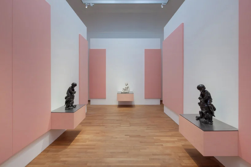in designing the exhibit, formafantasma — appropriately led by two italian designers based in amsterdam — chose an elegant, understated style that lets the baroque artworks take center stage. the use of color and material — including the integration of kvadrat fabrics and warm hues — creates a contemporary environment for the 17th-century art. different colors have been used to define different areas of the exhibition, with consistent color applied to both displays and furniture.