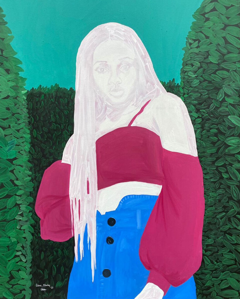 the artist invites the observer to take part in the subject’s narrative, almost unveiling the aura of the person portrayed. rendered with oil and acrylic paints on canvas, each oeuvre is strongly defined by the protagonist’s personality and their highlighted facial expressions. some of the persons he portrayed are known to him — like amoako boafo (a ghana-based artist) — while others were born of emecheta’s imagination.