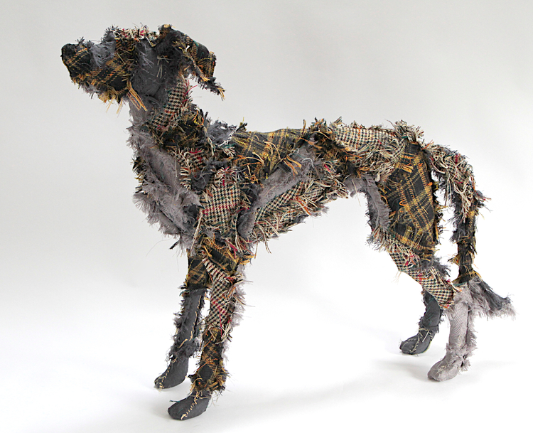 For the Shaggy Dogs series, the artist used her own pet as inspiration, stating he models for her frequently. The sculptures have been covered in her own daughter’s old trousers, a friend’s old curtains, and her grandmother’s old tapestry among other textiles. The patchwork series also includes a hare and two rats.