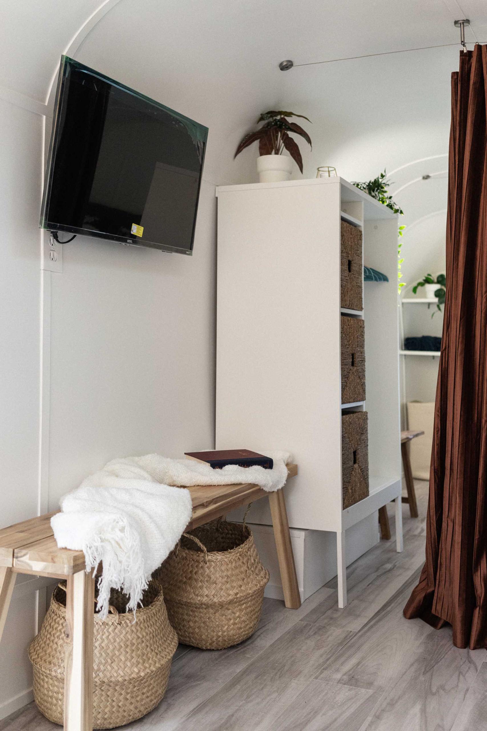 Stepping inside, we see the light and bright interior is completely opposite to the dark exterior. The entryway includes a bench with a couple of storage baskets and a wall-mounted tv.
