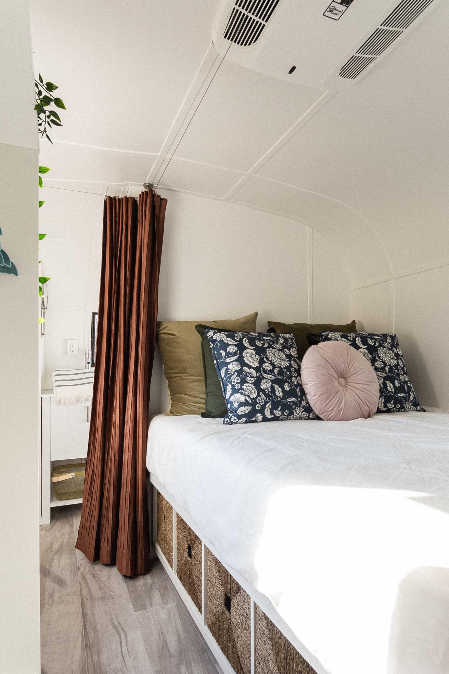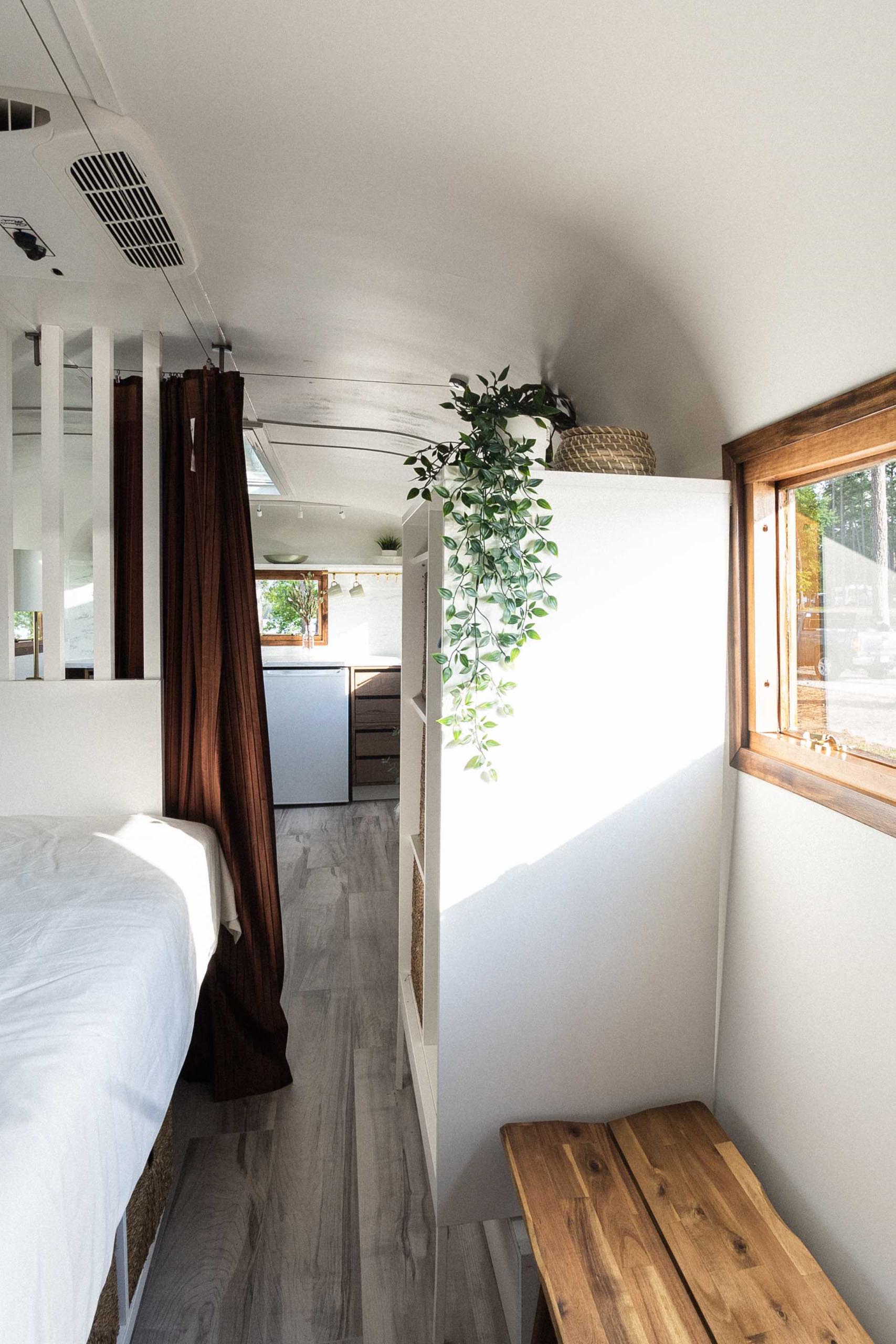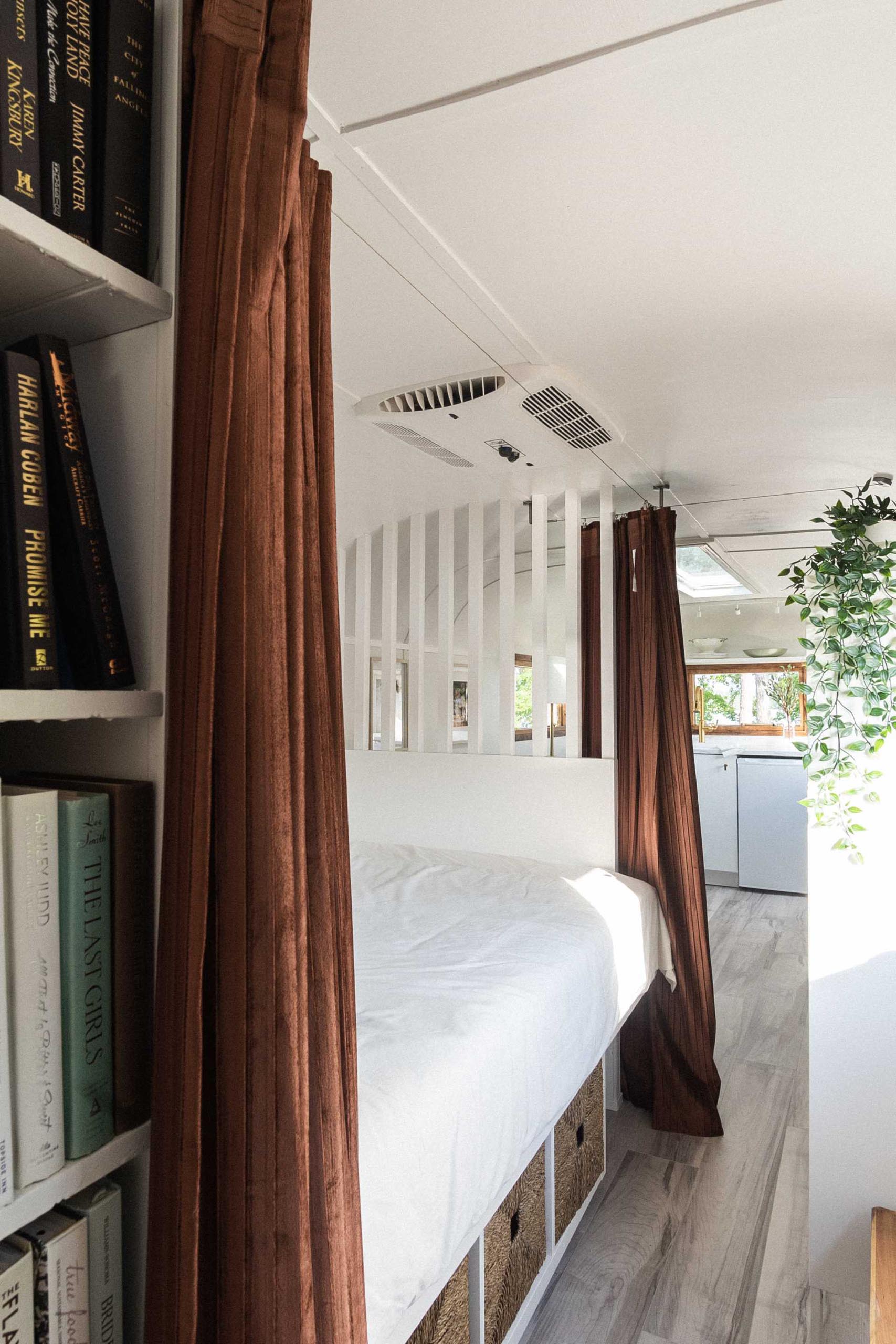 A partition and curtain separate the living room and kitchen from the bedroom, where you’ll find a raised bed with plenty of storage underneath. There are also built-in bookshelves and charging stations.