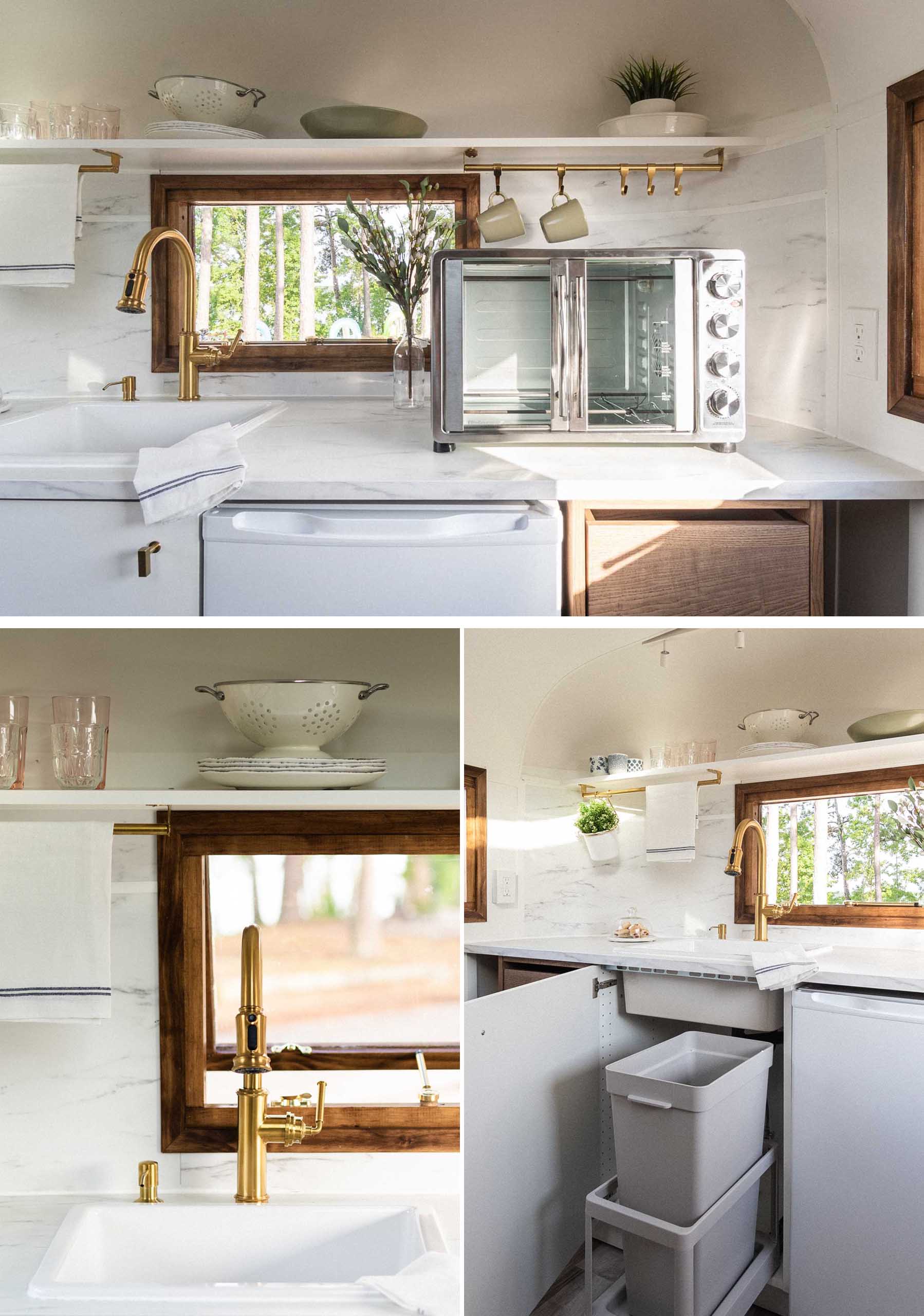 At one end of the trailer is the kitchen, with wood cabinetry, a shelf, and a light-colored countertop. There’s also an induction cooktop and convection oven.