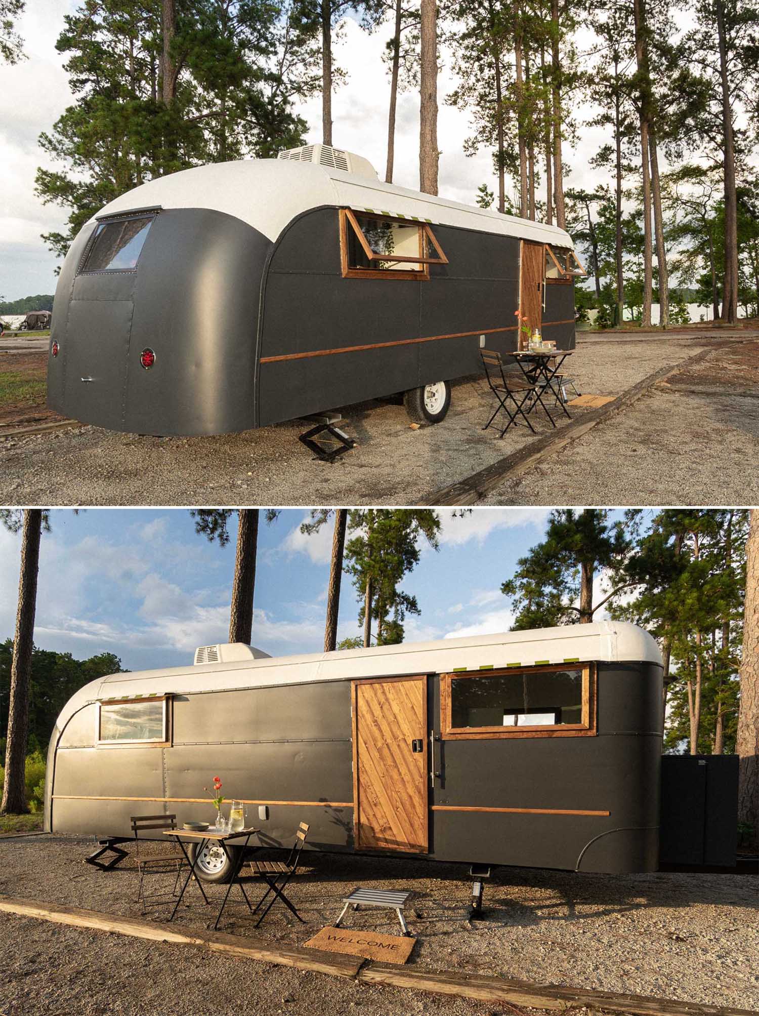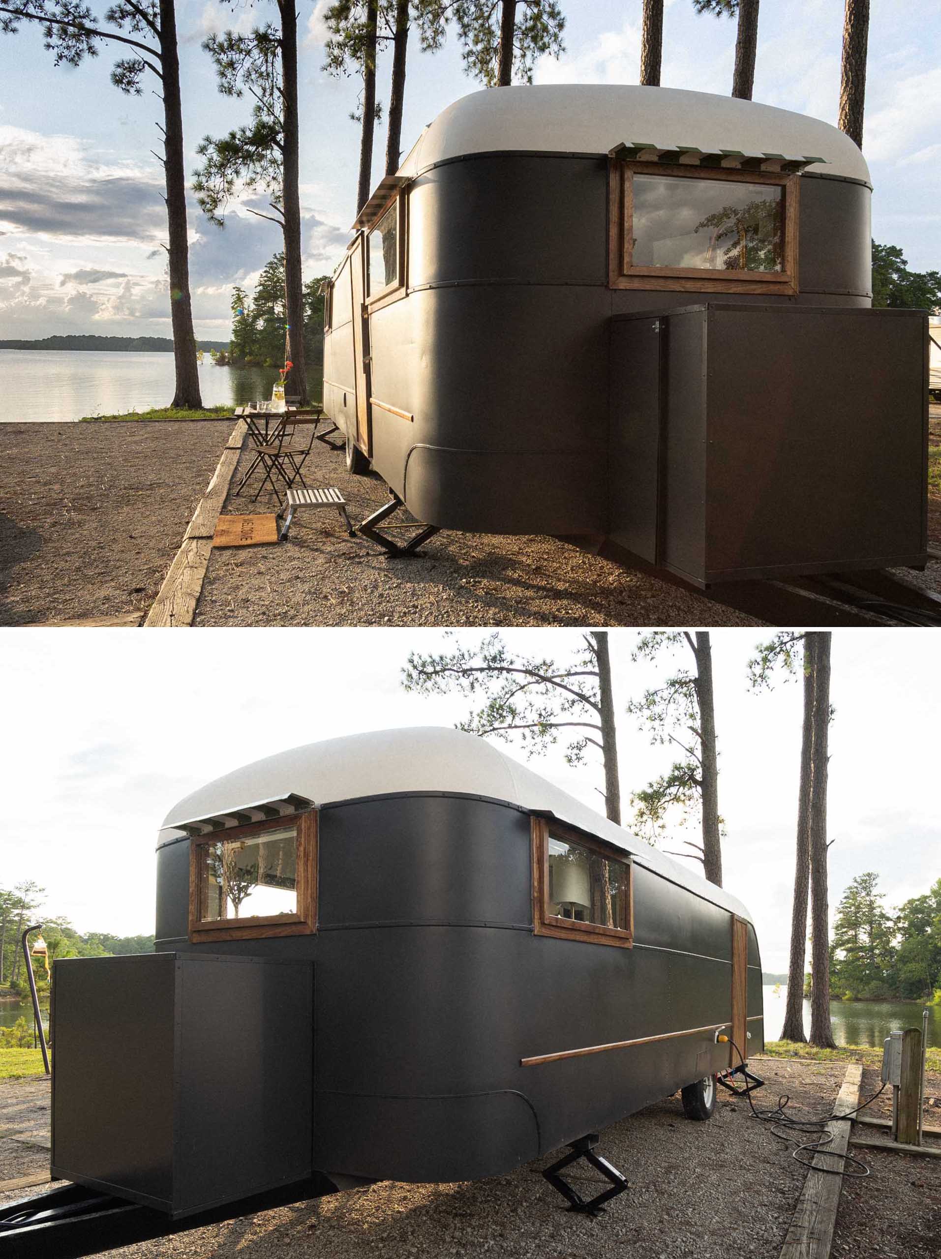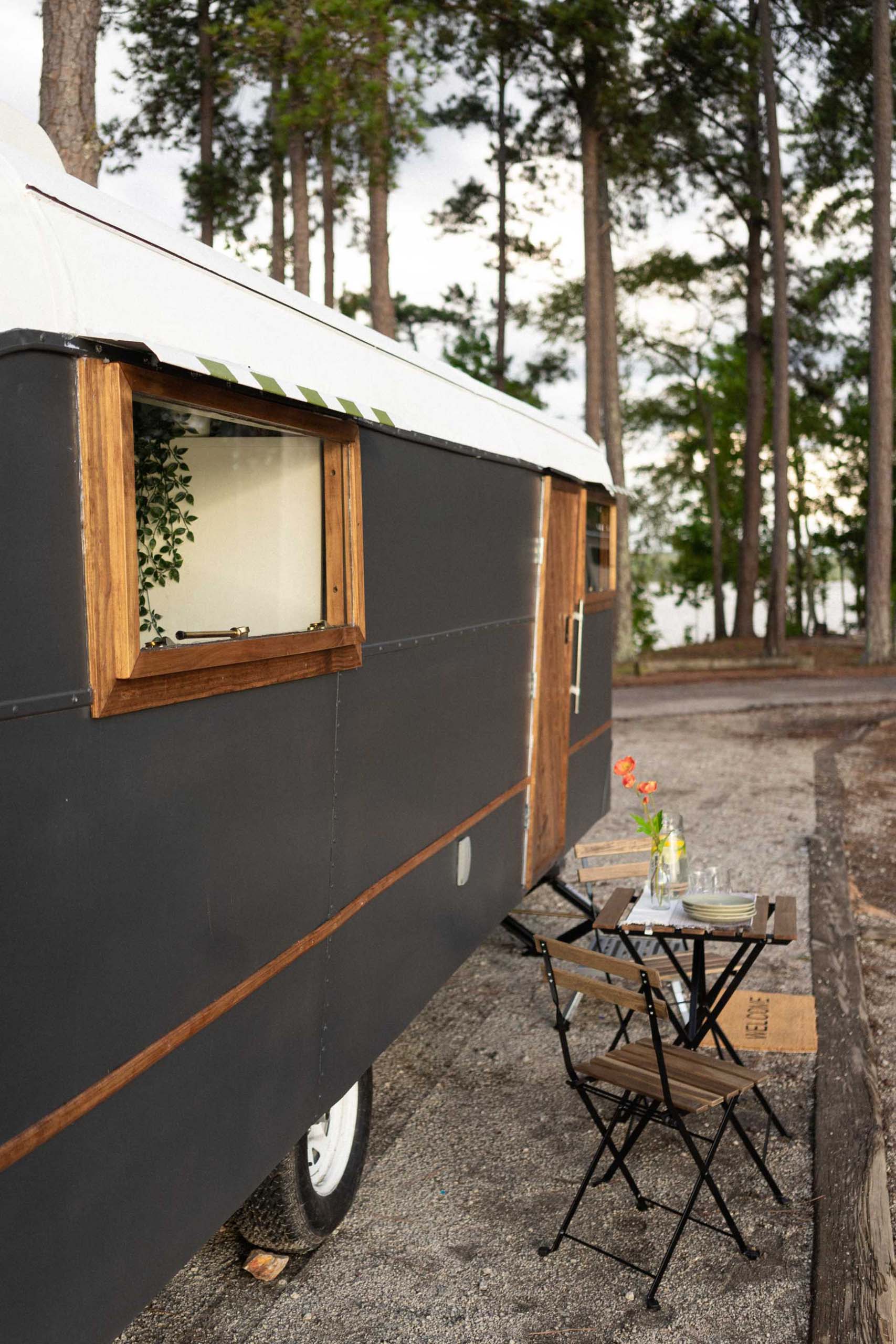 The exterior of the travel trailer is striking, with a matte black and white finish, and wood accents.