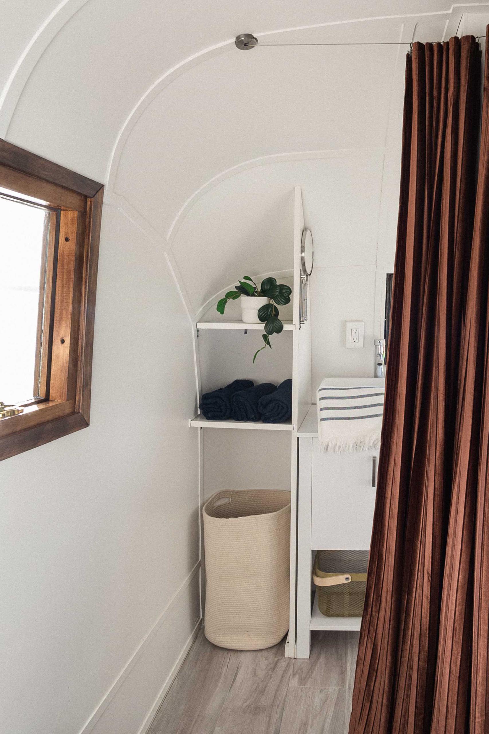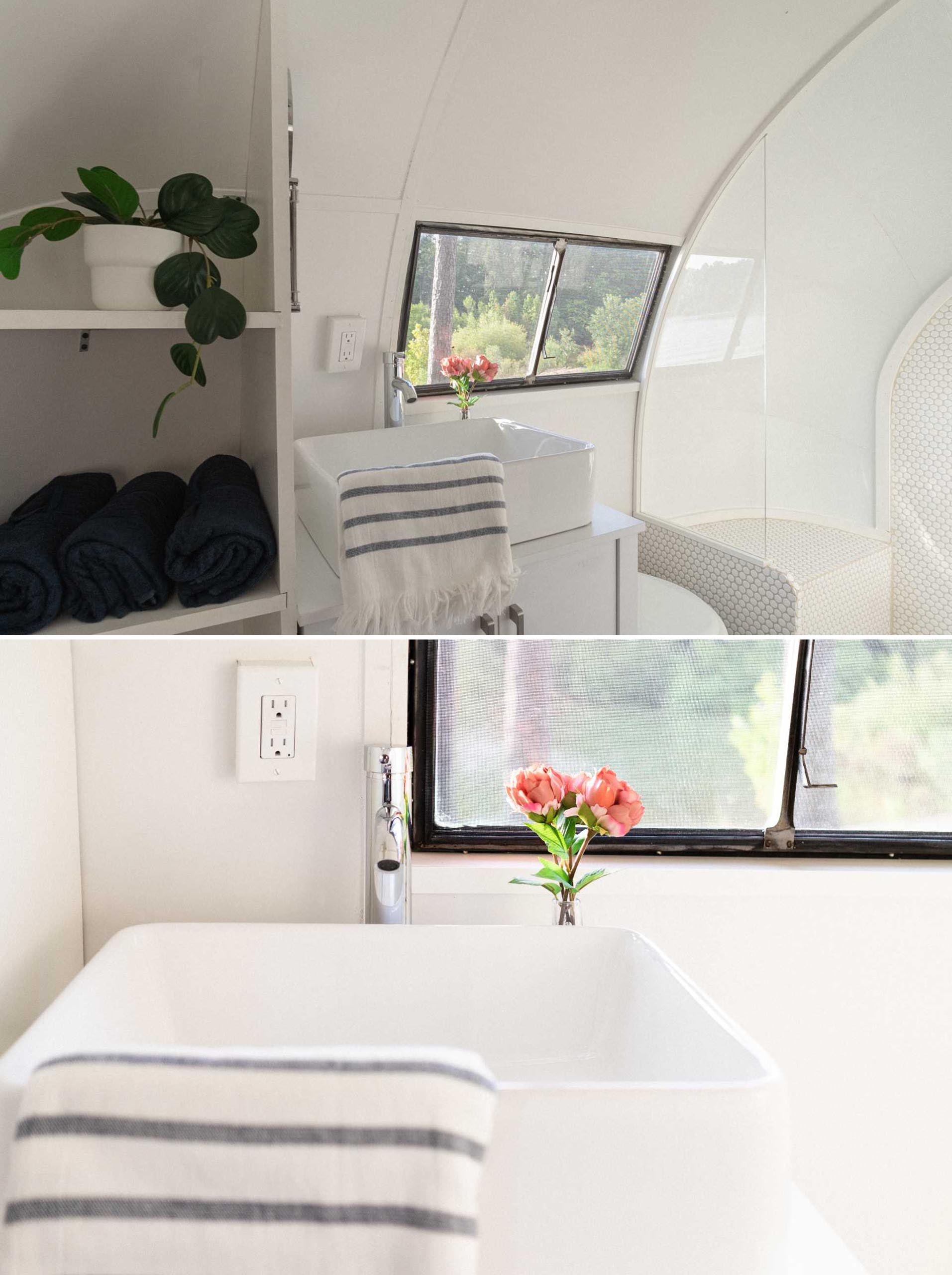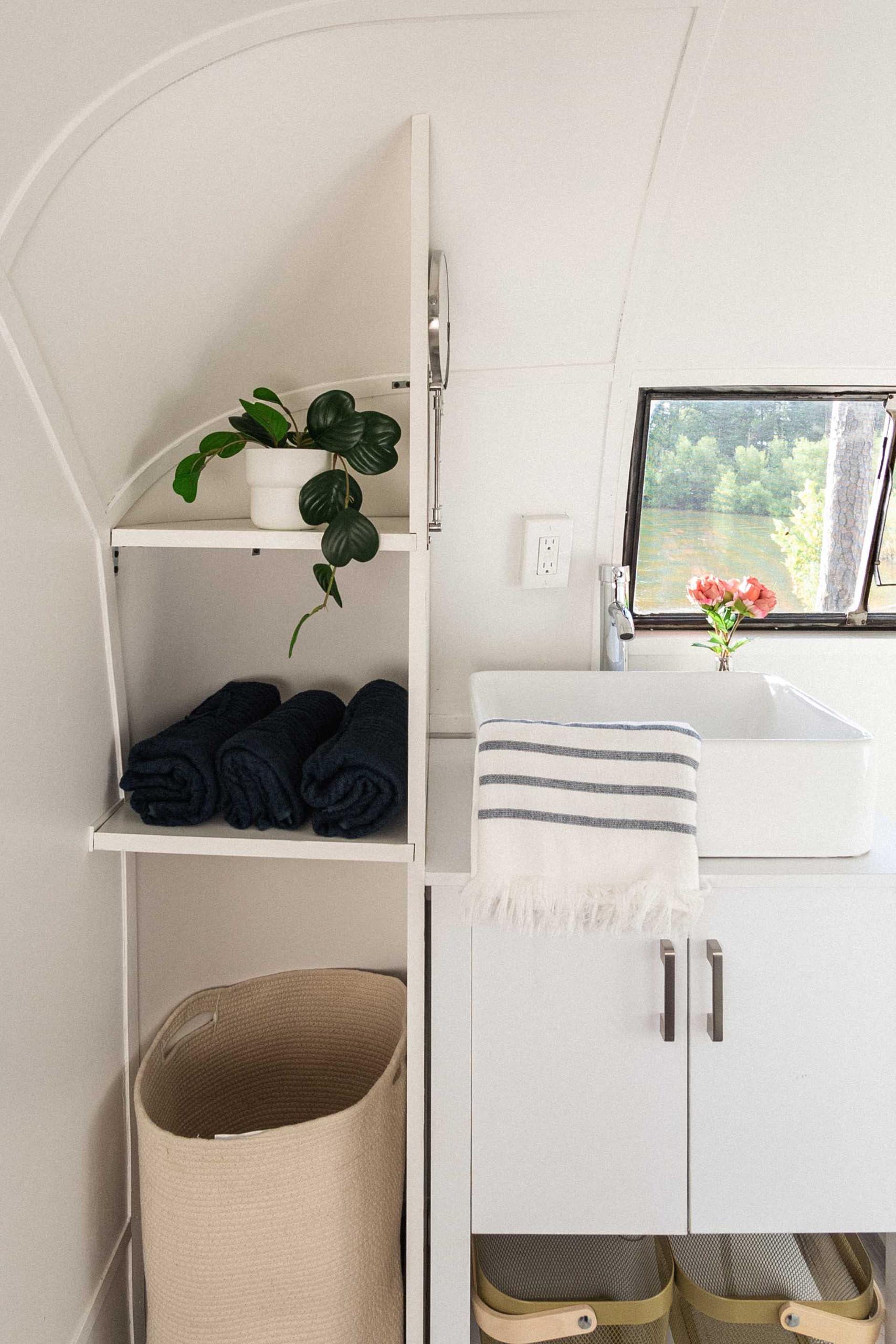 The opposite end of the trailer is home to the spa-inspired bathroom, with shelving, a vanity, toilet, and a shower.