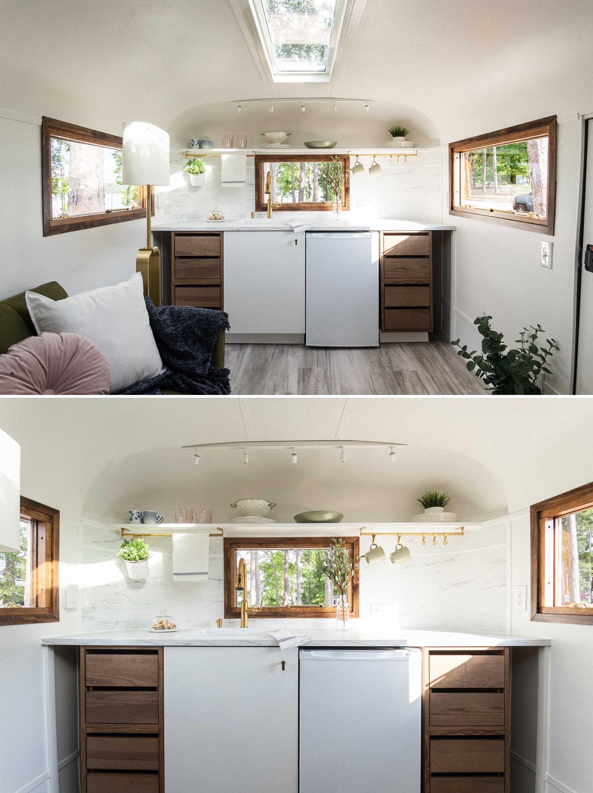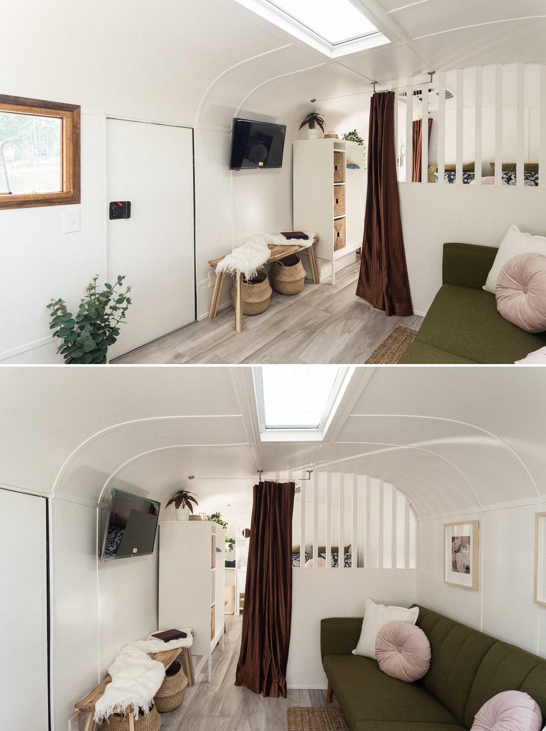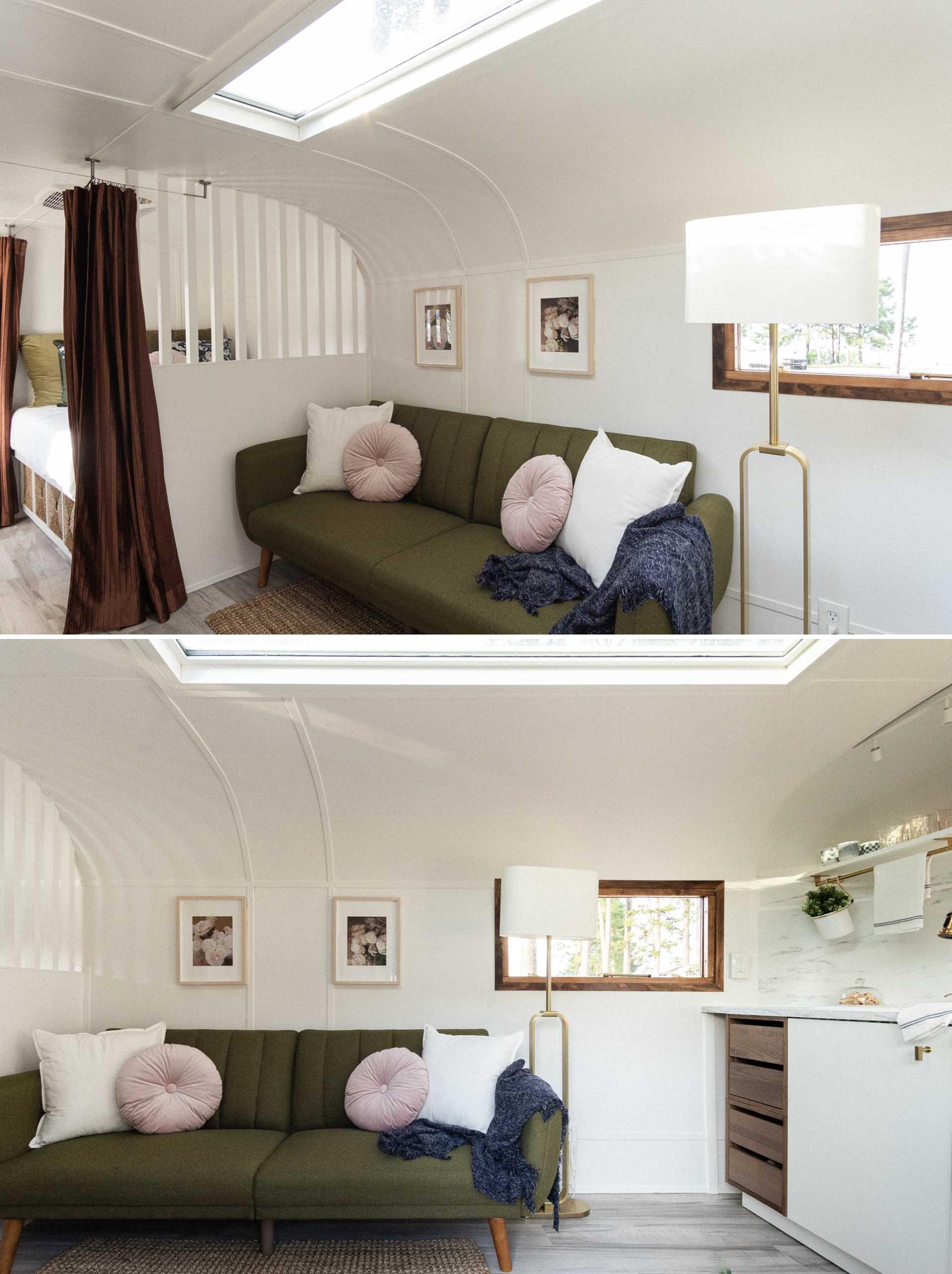 The living room is small but functional, with a sofa that transforms into a bed, allowing for two additional people to sleep in the trailer. Large windows, including a 6-foot skylight, add natural light to the interior and help to make it feel larger.
