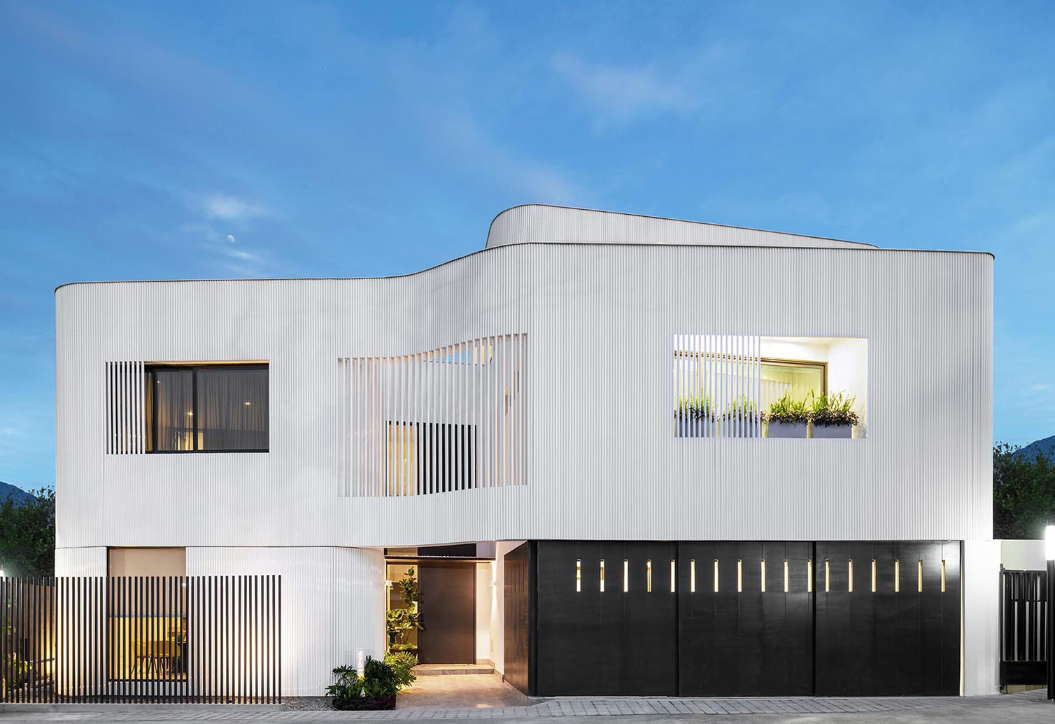 The white screen is contrasted by the dark bronze finish of the window frames, sliding garage doors, and pivoting front door.