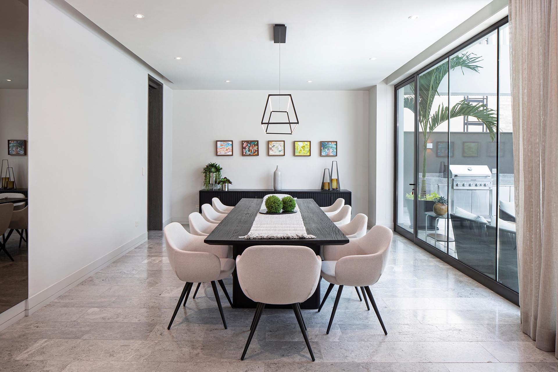Natural stone flooring can be found on the ground level, like in the dining room.