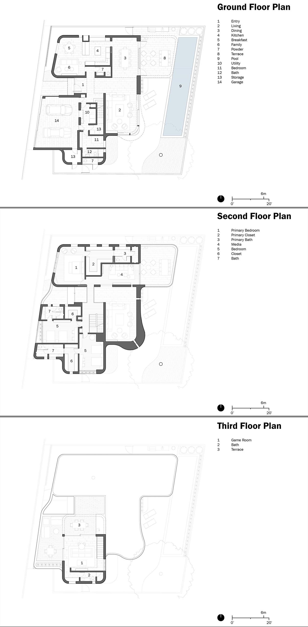 Rounded corners accentuate the flow of the exterior, softening the sharp corners created by the trapezoidal site.