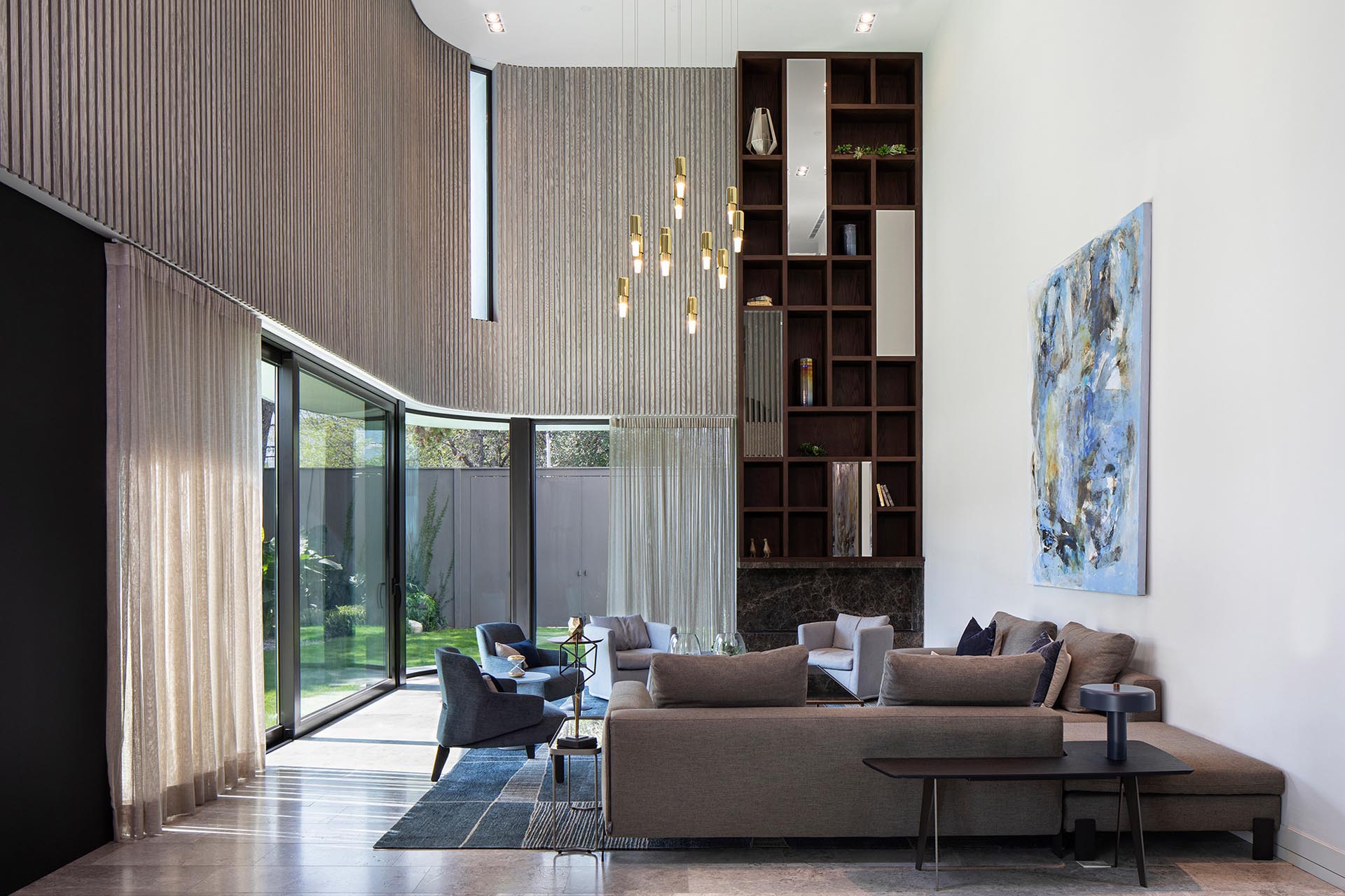 The living room opens up to the backyard via two large sliding glass doors that retract into a hidden pocket. Vertical wood paneling echoes the pattern of the exterior pipe screen.