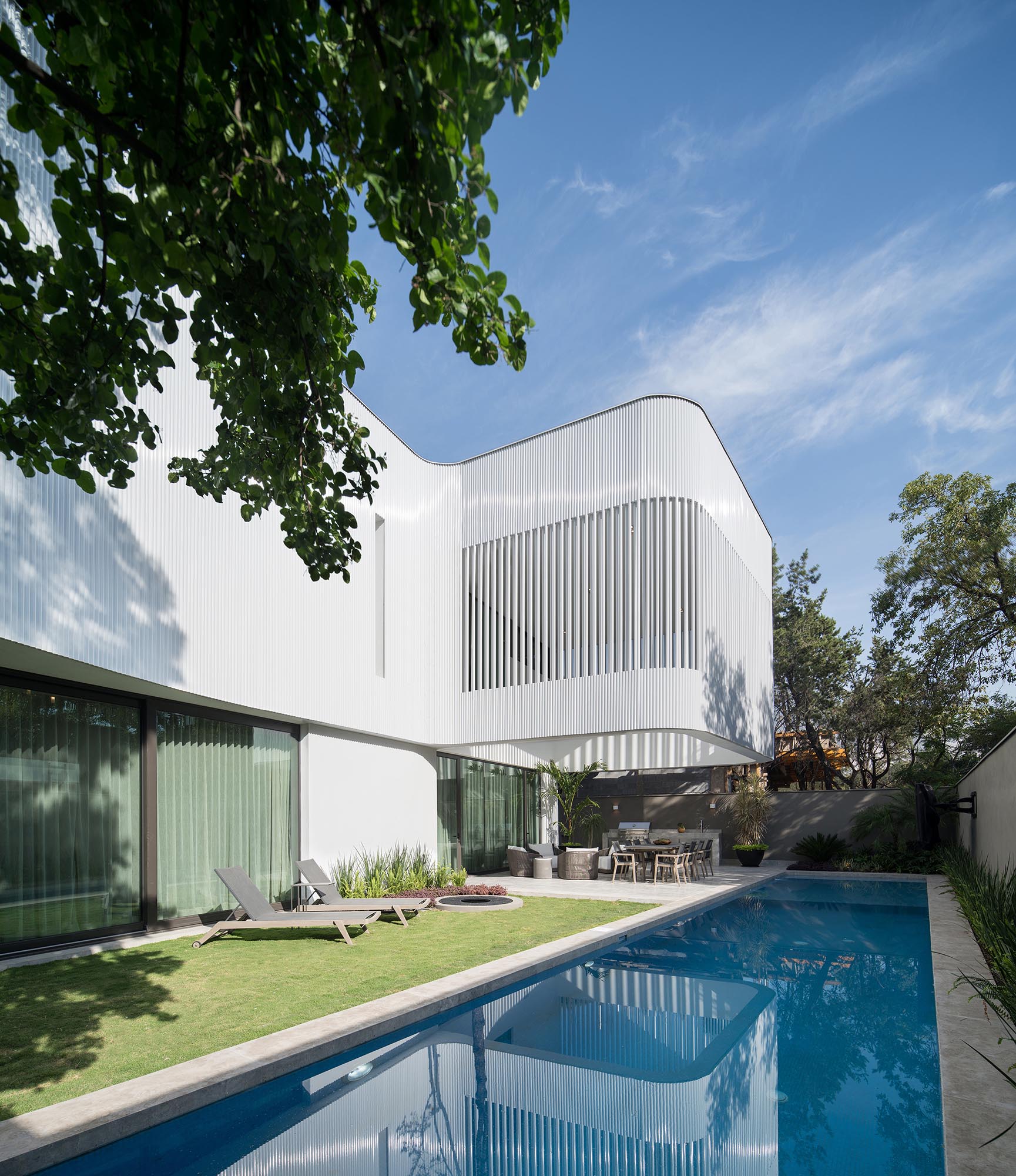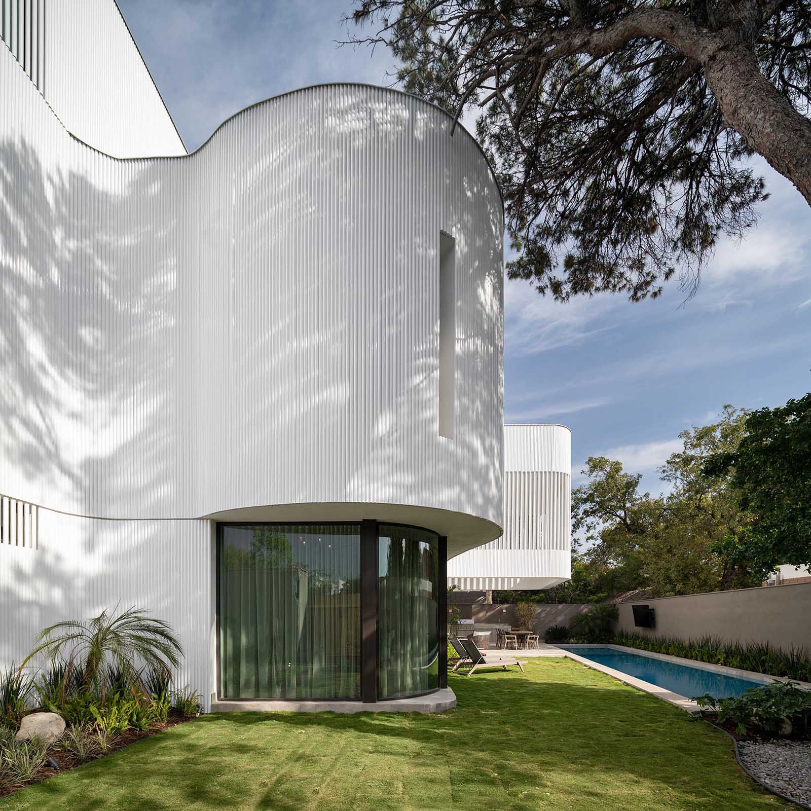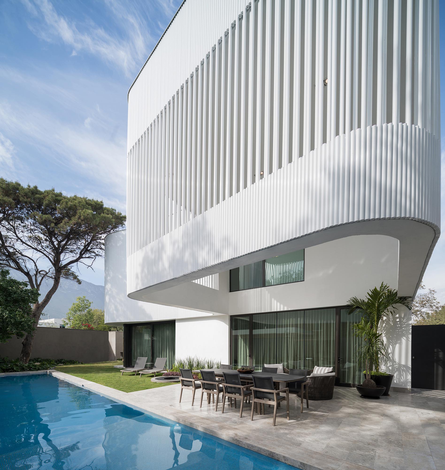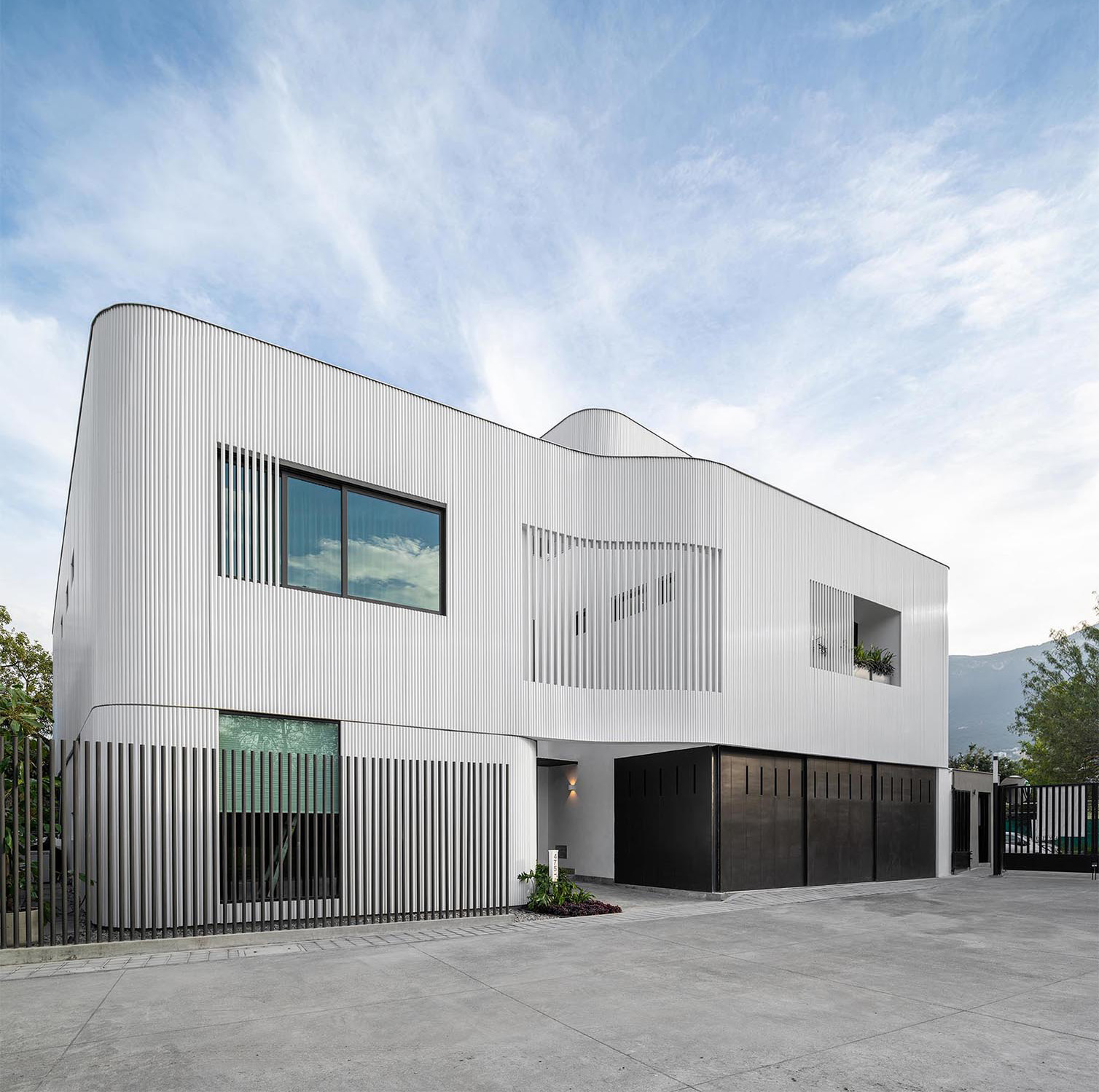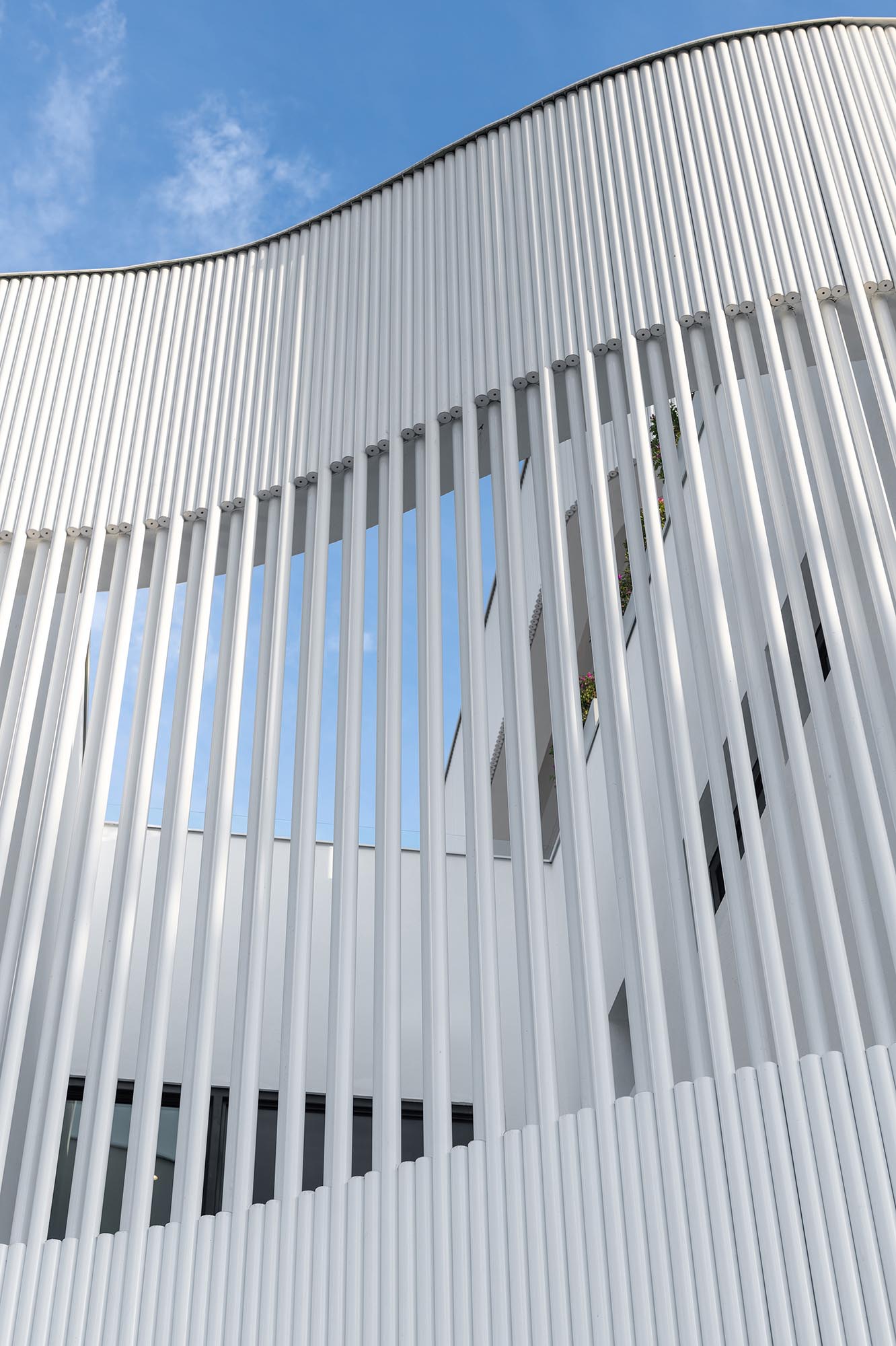 The textured facade was created from white metal pipe screens that recall the industrial origins and metallurgical history of the old town of San Pedro Garza García.