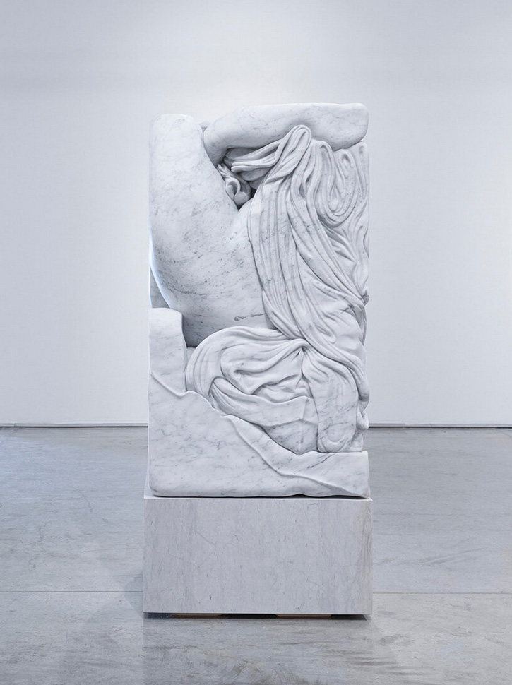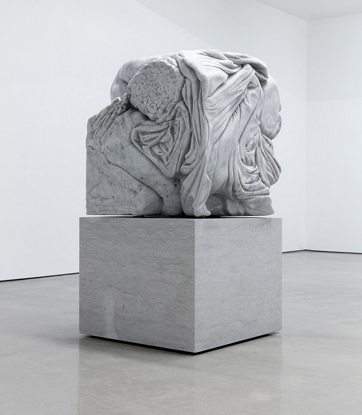 Designboom_ The Hole L.A. presents six new sculptures by Adam Parker Smith in the form of Crush, the artist’s fifth solo exhibition with the gallery. While furthering Smith’s stylistic sense of humor and long-standing investigation into the legitimacy of classical forms, this show represents a monumental departure for the artist in terms of both material and scale. Occupying one cubic meter each, Smith’s new Carraramarble sculptures are at first glance both instinctively recognizable and bizarrely uncanny, as though the canon of classical statuary has been run through a trash compactor.