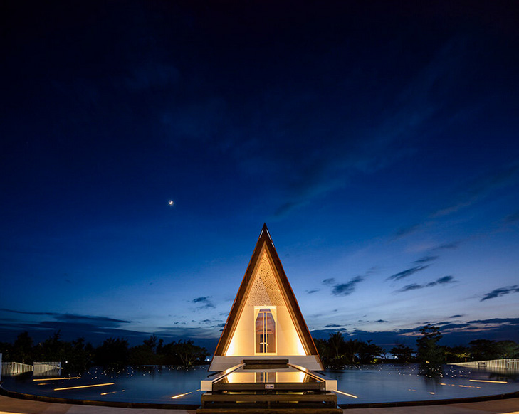 the chapel has been created with abstract, pure, mysterious and romantic geometrical space, allowing people to find a place to live in the spiritual pursuit of happiness, bringing joy and inspiration. the meticulously arranged classical axis sequence, the narrow passage up the stairs, the gurgling water curtain, the quiet pool, the towering bell tower, the mysterious sign, and the sunset glow in the sky result in the most sincere design blessing.