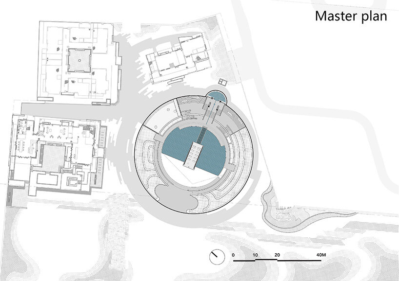 the base is circular, referencing ancient ritual places like stonehenge. this circular volume offers an open view to the sea while supporting the triangle. this sharp form breaks the completeness and softness of the circle while piercing the sky, indicating our yearning for establishing a relationship with the divine. a straight line that deviates from the center splits the circle into two pools of varying heights, with a water curtain in between. two walking paths are formed by the two high walls and ramps in the courtyard. the lofty walls cast a large area of shadows on both paths.