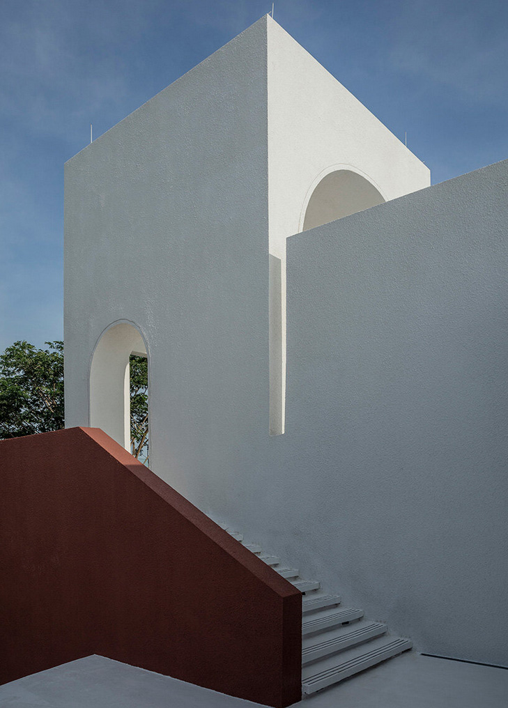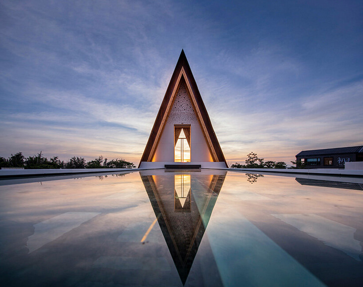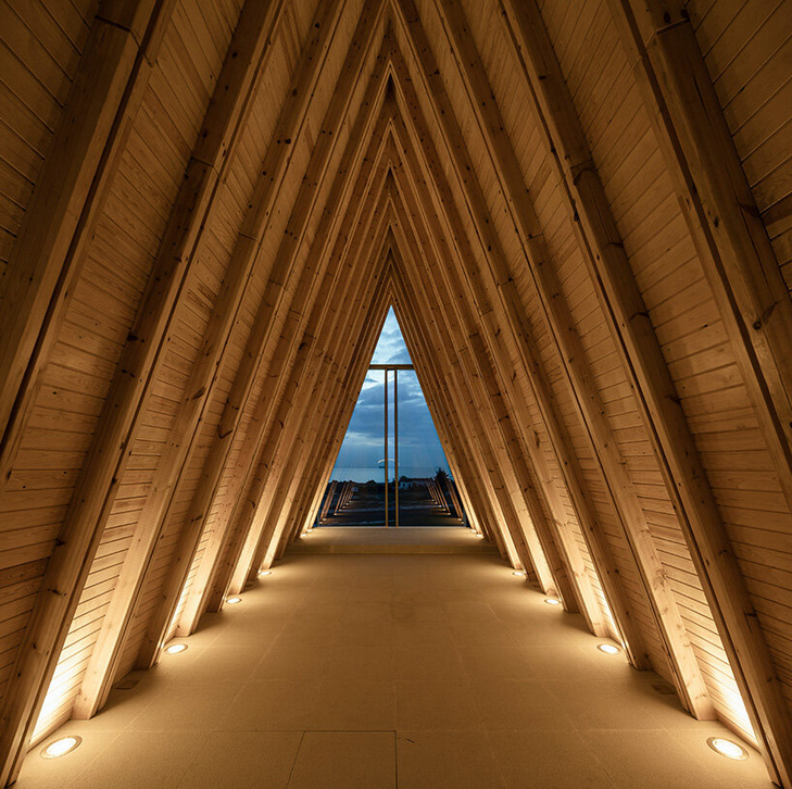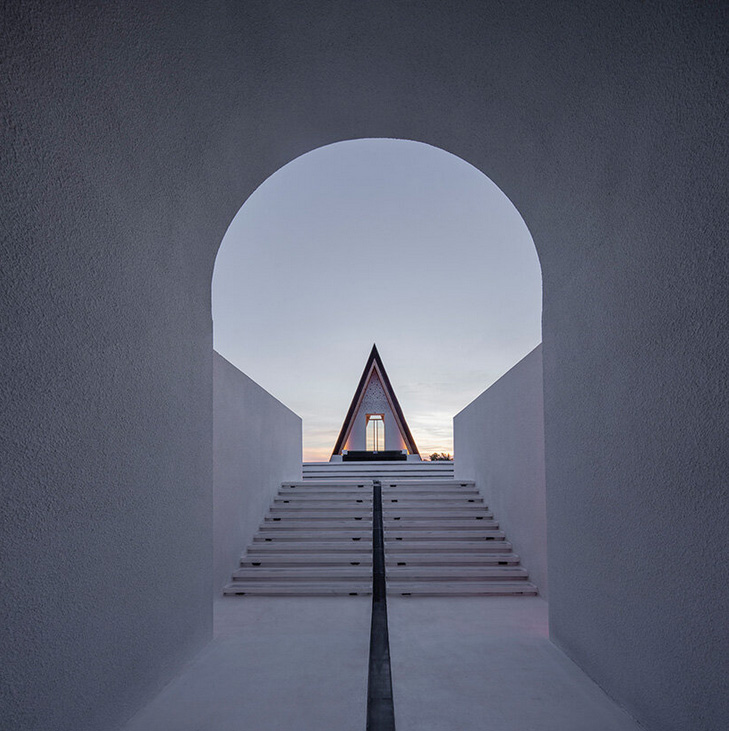 the chapel adopted a classic, symmetric layout to emphasize the sense of ritual. on the axis of entering the chapel, a bell tower is added as a ceremonial node of the space.the vaulted bell tower and the mysterious triangular chapel form a playful space similar to that in monument valley, carrying memories of the bygone times as well as a futuristic vibe.