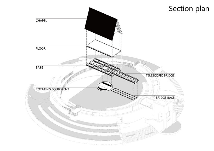 erected between the boundless sea and sky, the measurable building volume reveals a rotating device that orients itself towards the position of the setting sun all year long. UDG (shanghai united design group co., ltd.) wanted to express and highlight the surrounding nature, including the sunset. the design combines local cultural elements and excellent natural landscape resources, and integrates romantic weddings and love into the venue.