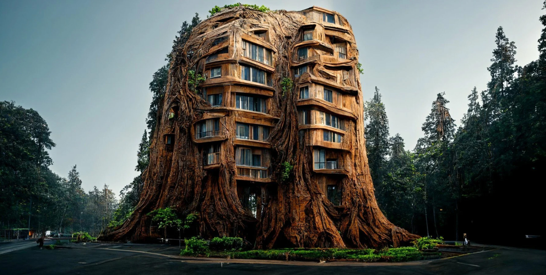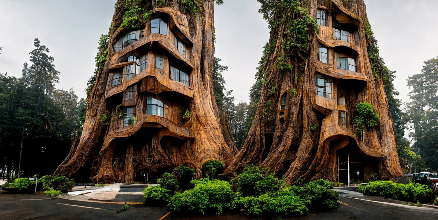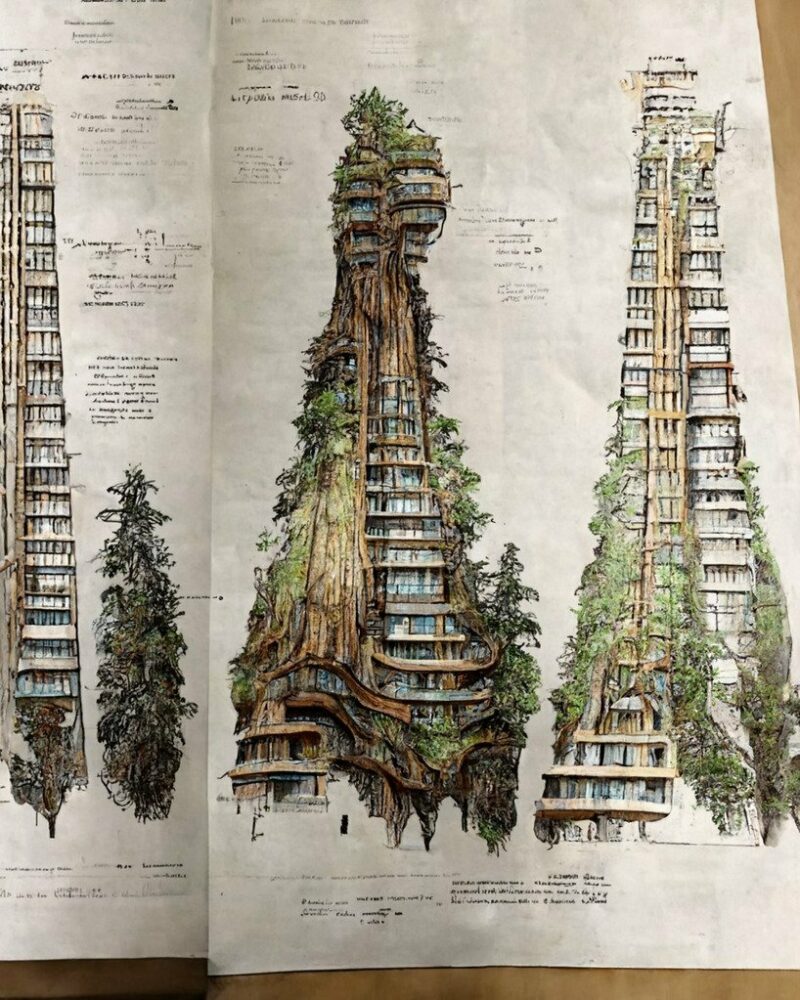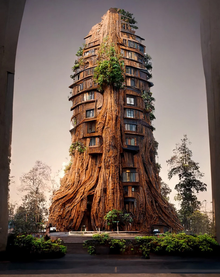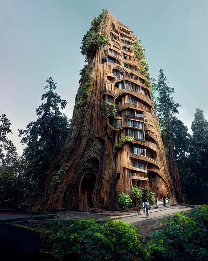 Designboom_ Utilizing the potential of artificial intelligence (AI) tool Midjourney, architect and computational designer Manas Bhatia imagines a surreal future with his new project, Symbiotic Architecture. Inspired by the Hyperion tree, in this concept the Indian designer envisions a future occupied by symbiotic apartment towers that breathe and grow, appearing as giant hollow redwood trees. The architect questions: ‘Can the envelope in which we live breathe as creatures do instead of us dwelling in air-conditioned concrete and glass boxes we call apartments?’Exploring the relationship between living creatures, nature and architecture, Manas Bhatia presents his conceptual research imaginations as a series of AI-generated images, and drawings that depict surreal ‘living’ apartments that are entirely integrated into nature.