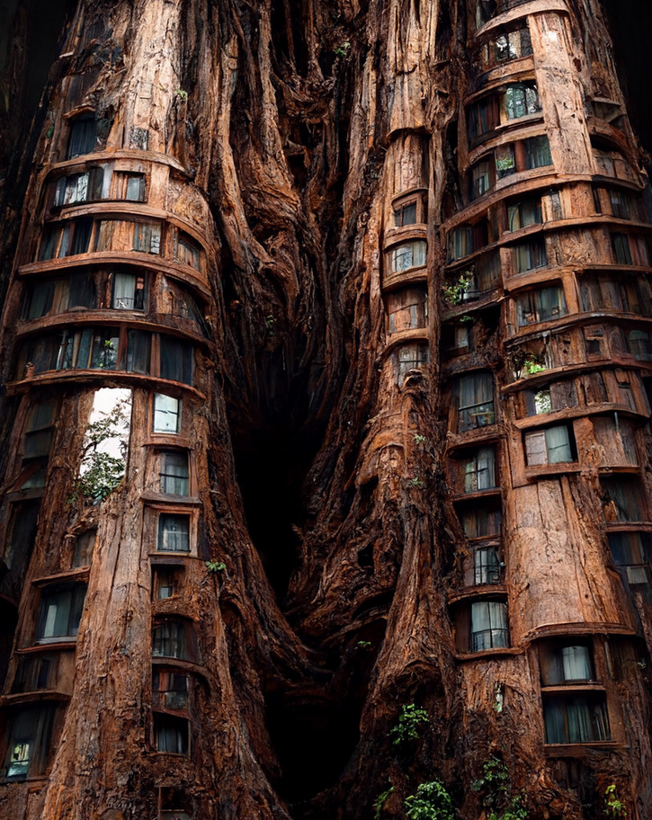 Aiding his conceptual research imaginations, Manas Bhatia utilizes the AI program Midjourney to generate this architecture that is symbiotic in nature. The architect fed the program a series of text-based prompts, including a combination of words such as ‘giant’, ‘hollowed’, ‘tree’, ‘stairs’, ‘façade’ and ‘plants’, to generate an array of images in response. Then in an ongoing process multiple iterations were run and the prompts were altered to achieve the desired results. The result is a surreal series of apartment buildings that take on nature completely. Hollowed-out Hyperion trees are transformed into functional breathing architecture, with apartments facing inwards and natural lighting sweeping in to create an illuminated, enchanted natural space.