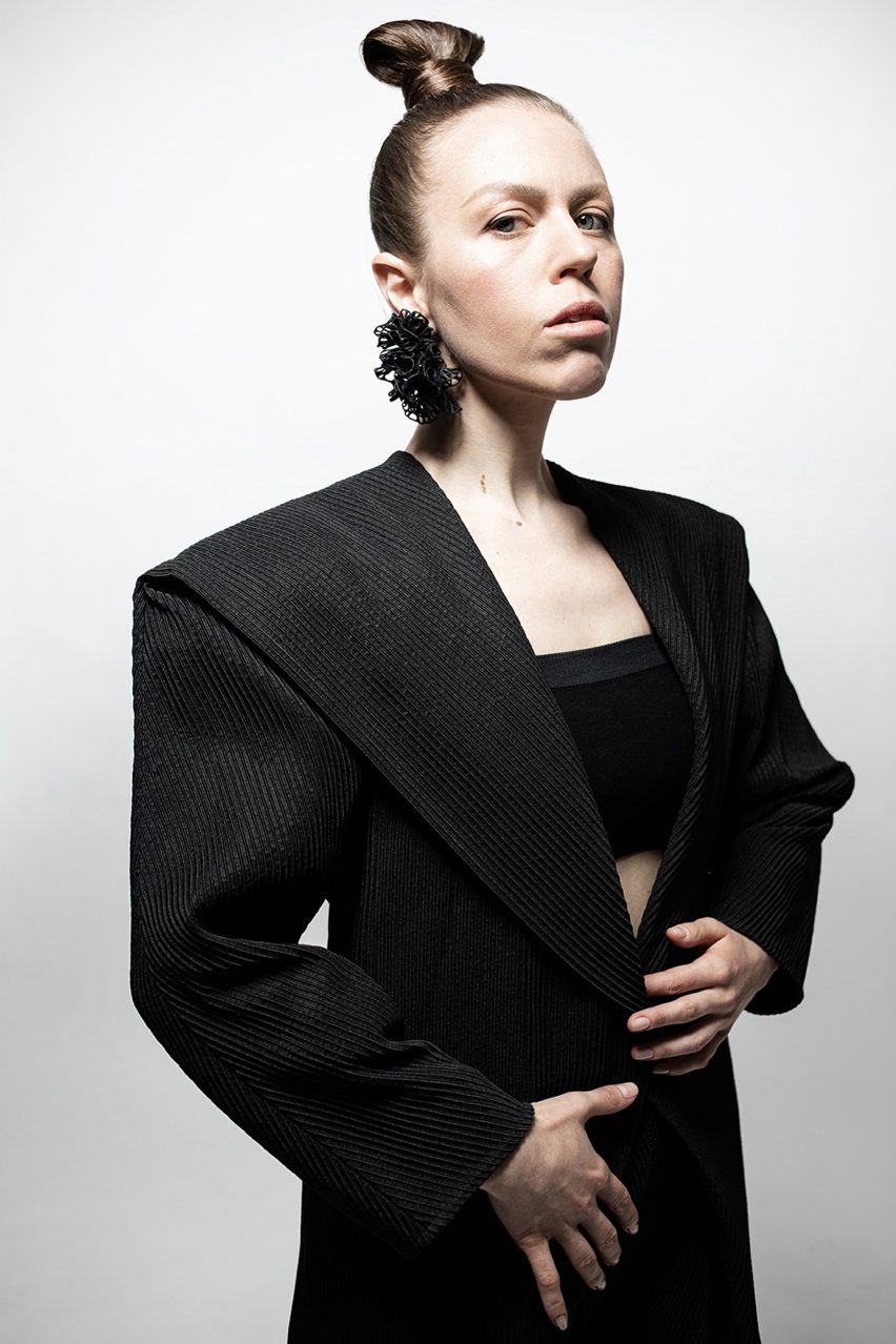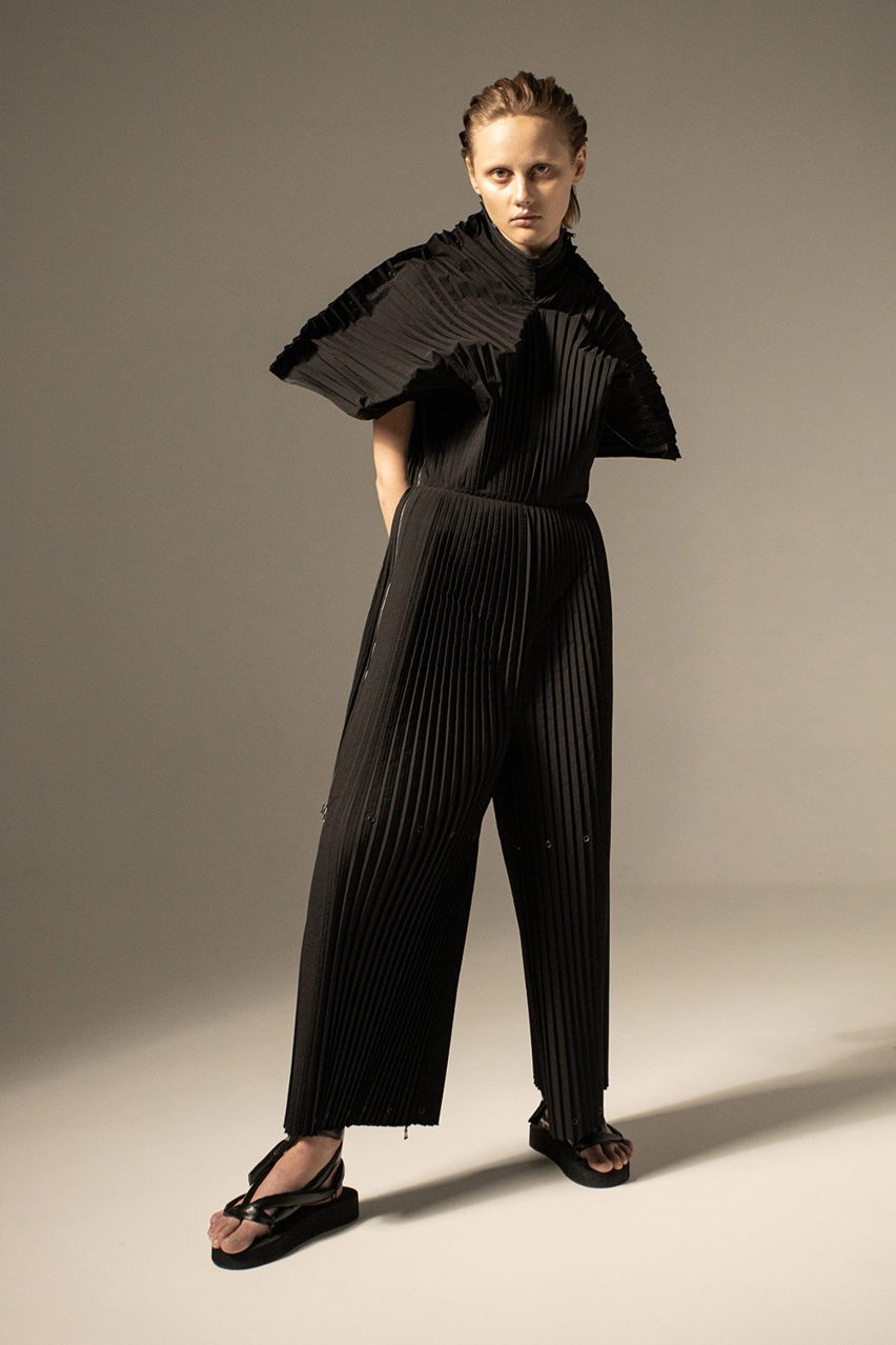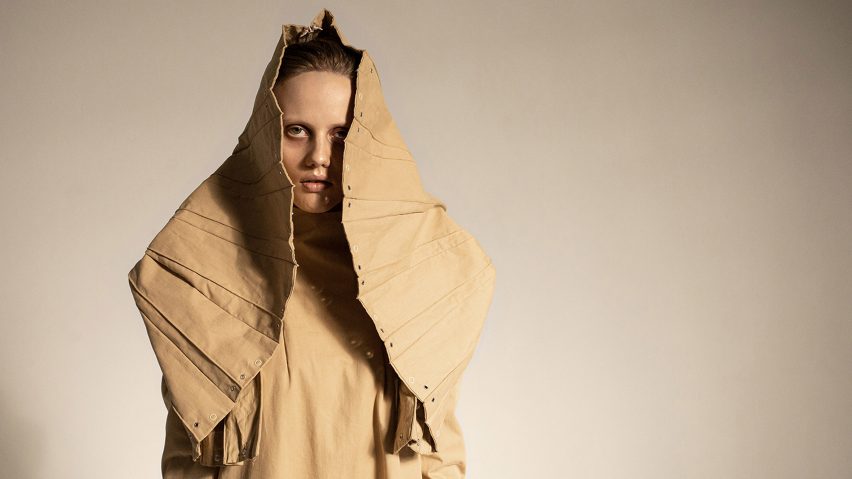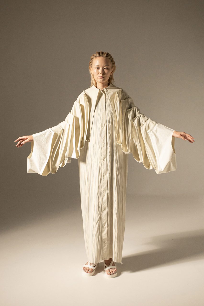 DZHUS is known for its architecturally precise garments, such as its previous Nihilism collection of clothes that can be folded into different angular shapes and another structural collection featuring silhouettes "dedicated to the evolution of earth".