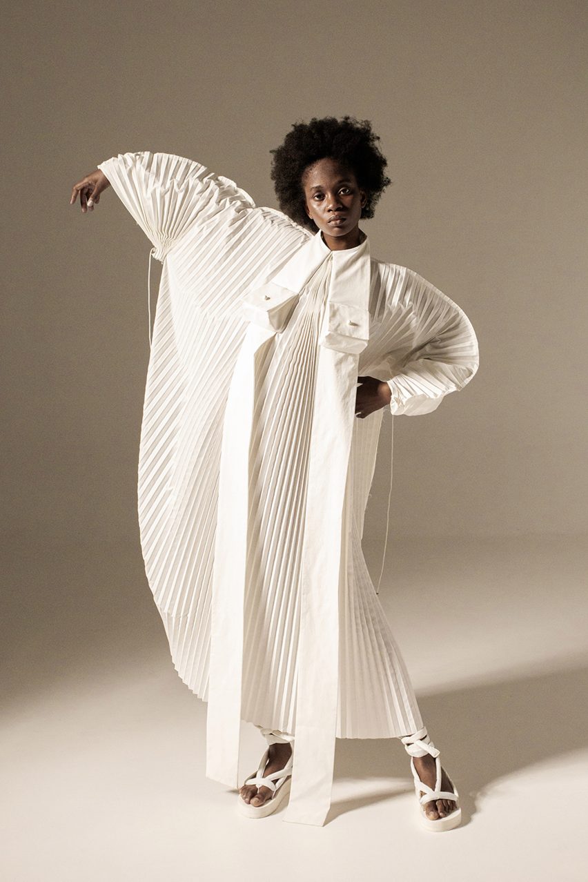 Selected pieces that have formed this reduced collection include a four-way transforming maxi dress made from creased, ecru-coloured material and a statement shirt featuring a detachable pleated jersey hood that also doubles up as a bag.
