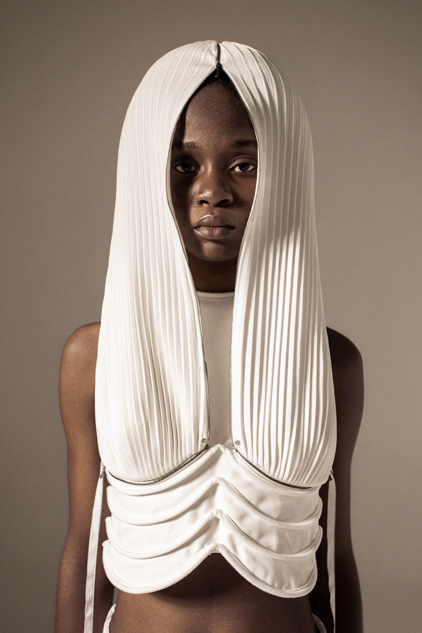 The Physique collection is characterised by dramatic, androgynous silhouettes crafted in materials such as ribbed wool and crumpled organza.
