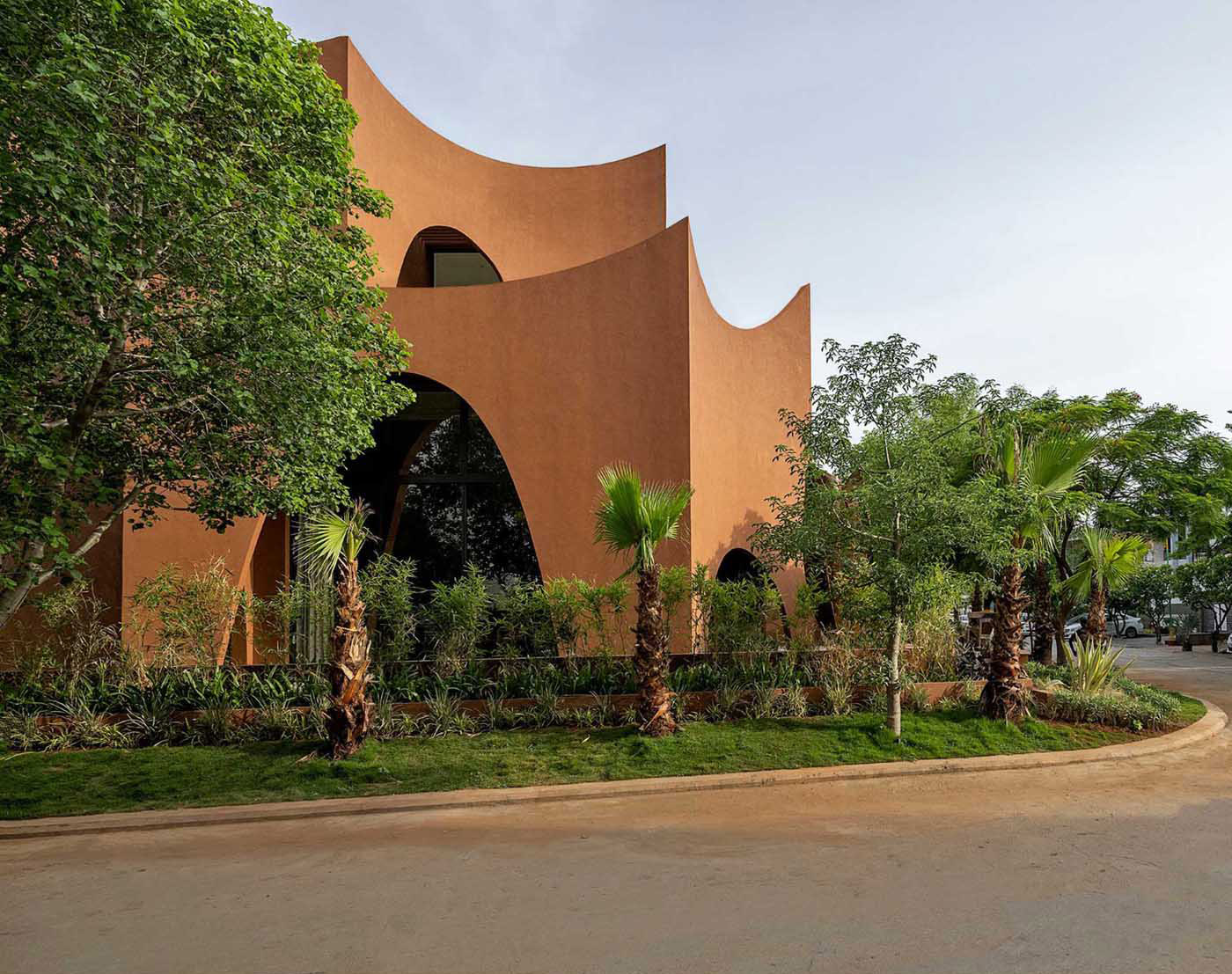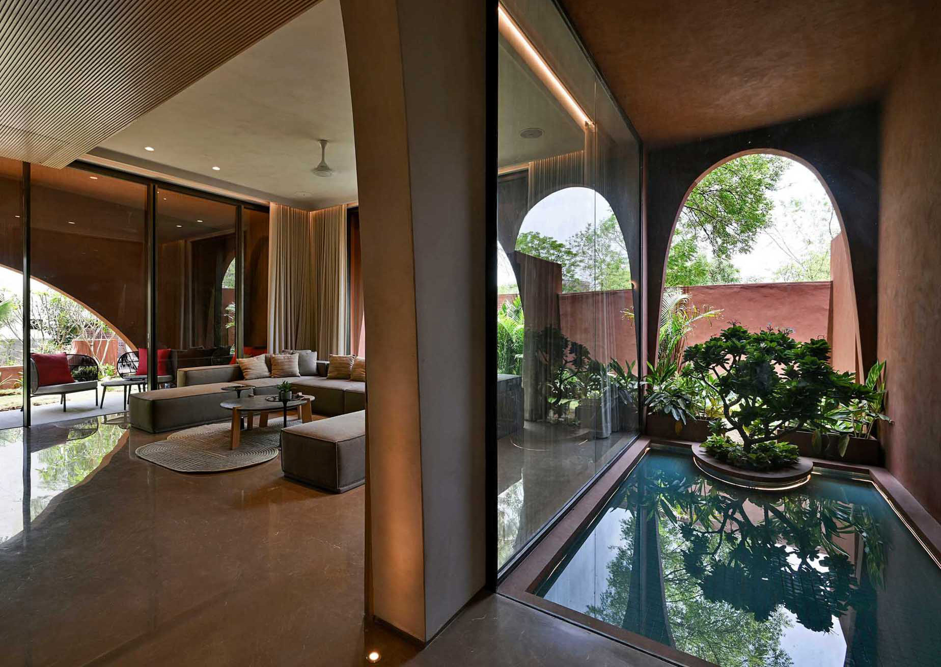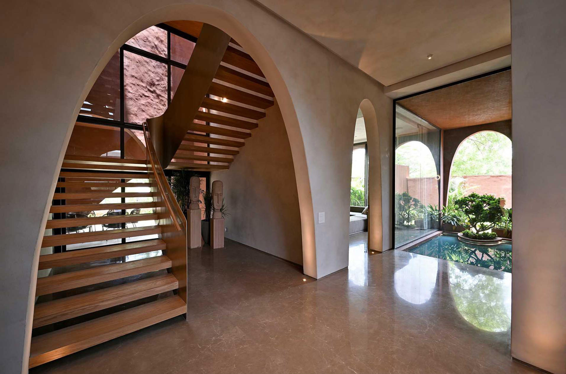 Built on a corner lot, the home has been designed with various heights where arches create openings to help keep the house cool on a hot day.