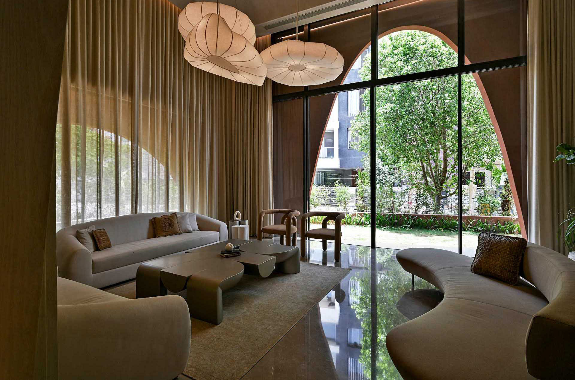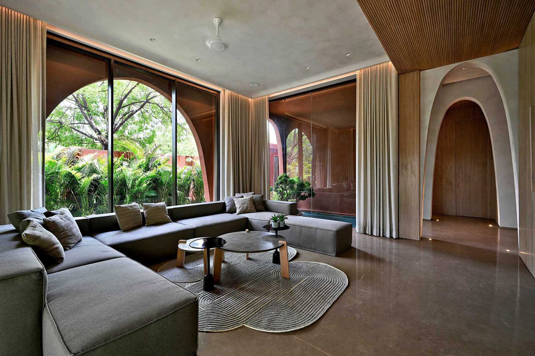 Inside the home, arches help to shade the interior spaces, like the living room, while also creating welcoming spaces that interact with people walking past in the hallway.