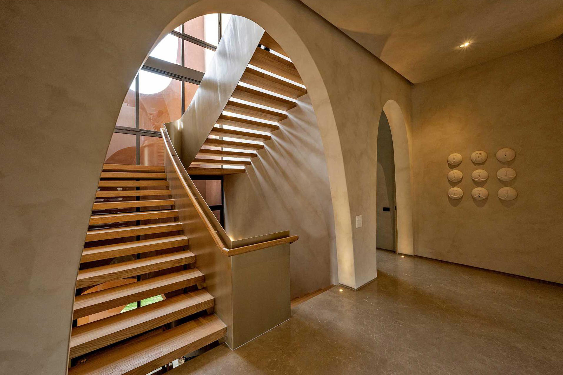 The wood and metal staircase connects the various levels of the home, with each level being greeted by an arch.