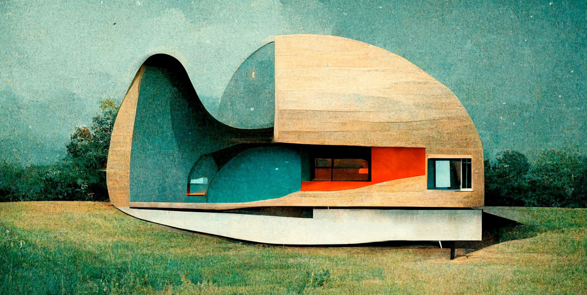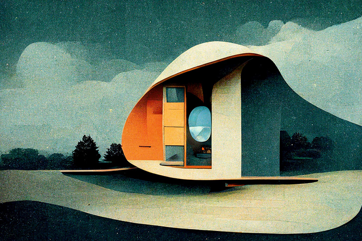 Breaking this mundane practice, ‘A house you say good morning to and hug when you come home’ instead envisions a more expressive architecture. Each of the homes from the series are unique and encourage individuality, inspired by an abstracted modernist aesthetic. Mathias Juul Frost Frost utilizes AI to present a conceptual architecture that opposes the typical box-like structures with bold, organic, undulating curves. The isolated homes depict distinct asymmetrical forms, with a natural wood-like façade and a warm, inviting primary color palette. ‘The project illustrates, through the small, curiously charming ‘dwellings’, what it would be like again, to want to say good morning to a house and hug it when you get home’,notes the designer.