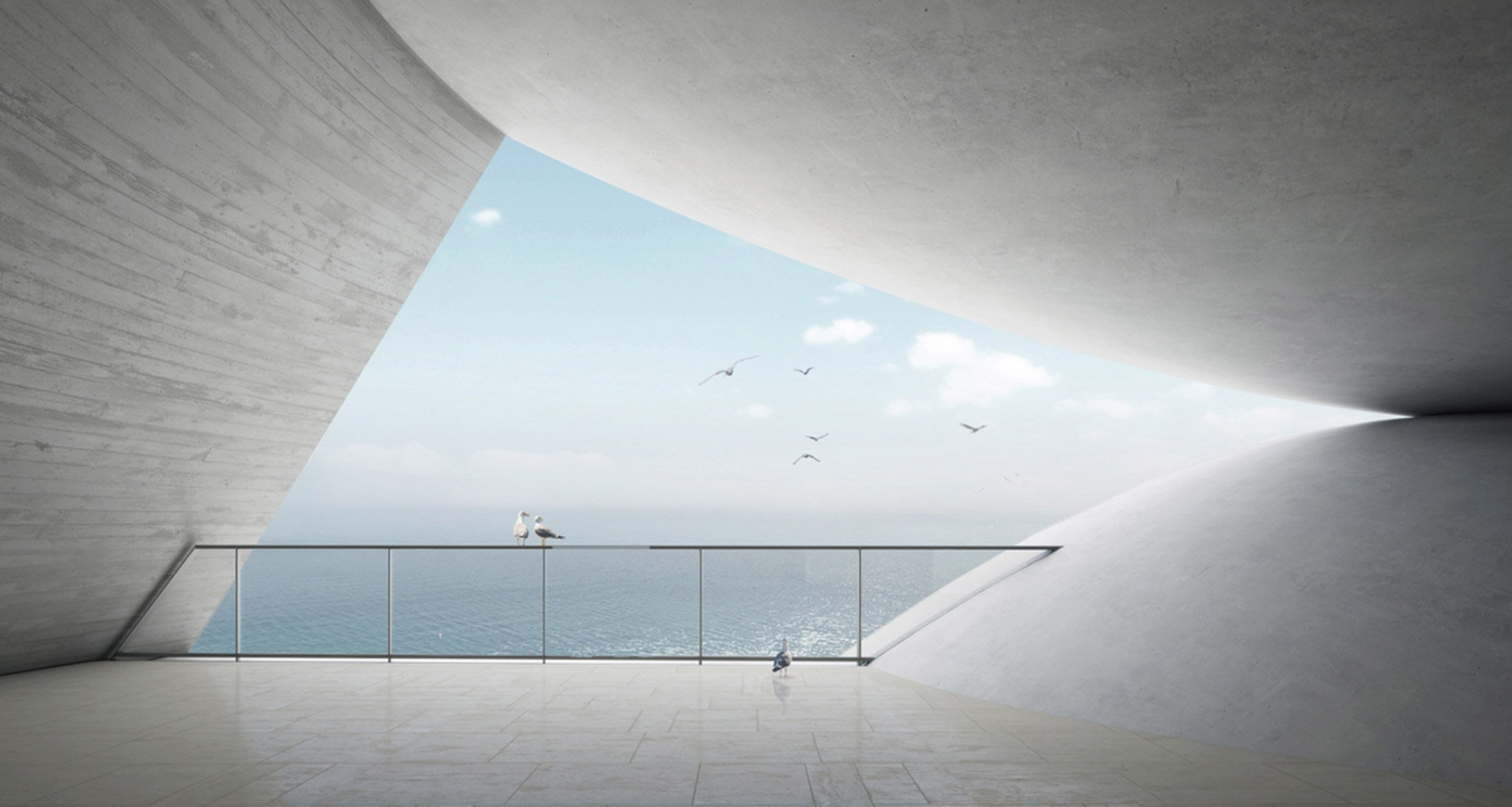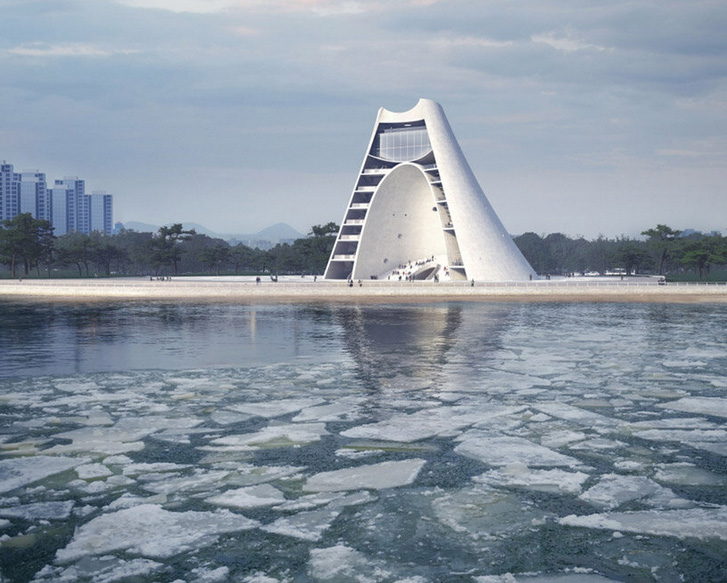 the ‘sun tower’ by OPEN architecture takes shape as a large curving volume, its geometry directly informed by meticulous sun studies. the structure implies a truncated cone, appearing to have been sliced open by beams of light to reveal its section to the sea. rising fifty meters (164 feet), the sun tower sits within a gently sloping plaza. the building is a composite shell structure, the complex design, developed in close collaboration with engineering firm arup, will be constructed as two layers of slanted concrete shells, connected and braced by horizontal slabs and ramps.