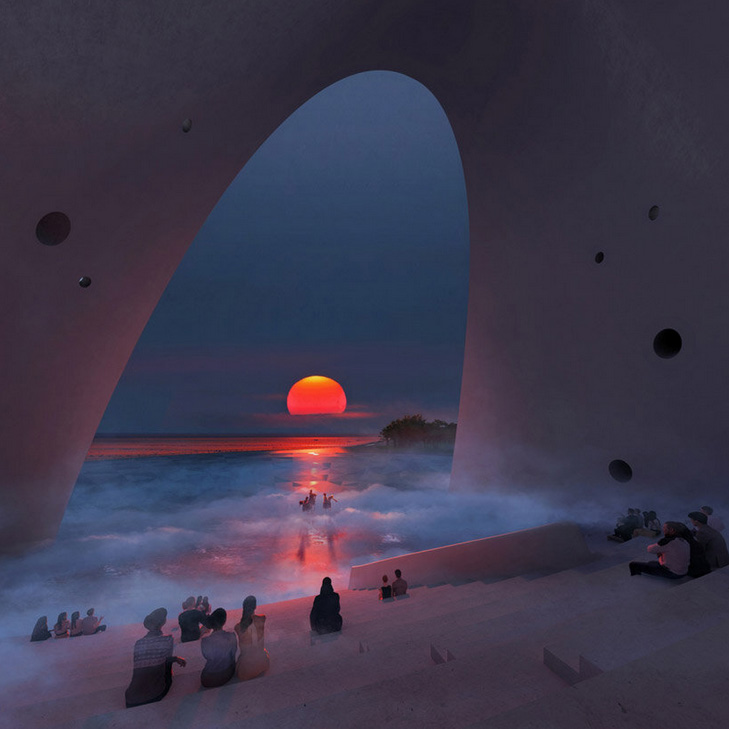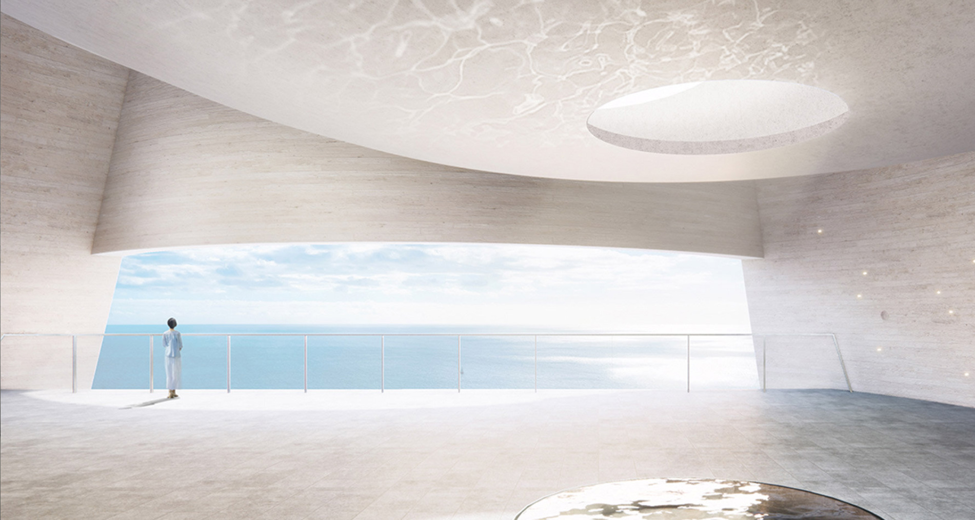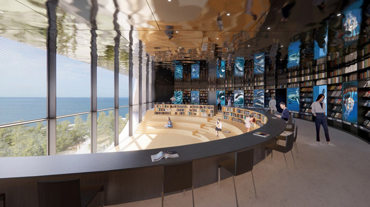 opening out toward the horizon, the sun tower’s concave inner shell acts as a sound collector to absorb and amplify the sounds of the sea. the smaller upside-down upper shell hosts the light-filled library and the ‘phenomena space’ with a breathtaking view of the ocean and the sky above. a central oculus in the ceiling of the phenomena space allows rainwater to enter and fill a small pool underneath in the summer. in the winter, the pool will be dry and used as a fireplace.