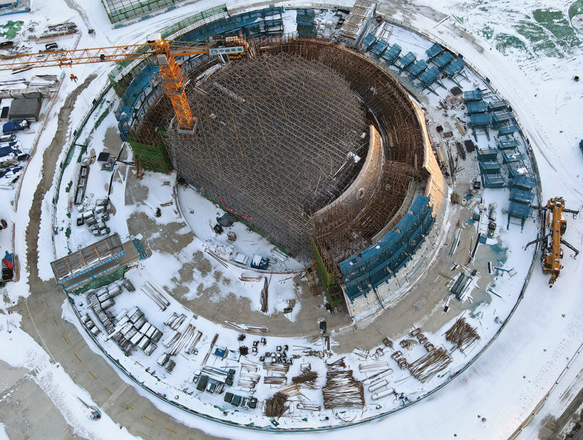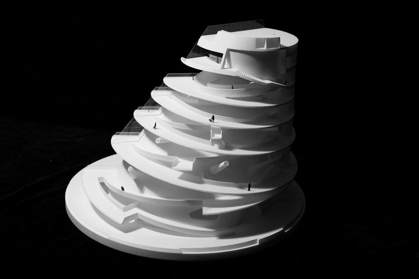 Designboom_ new york and beijing-based studio OPEN architecture unveils the design of its ‘sun tower’ as construction begins in yantai. emerging along the shores of the yellow sea, the work will stand as a beacon, and will house a ground floor, semi-outdoor theater, a winding exhibition space, and a library in the sky. these many functions will all be housed beneath a unique semi-outdoor ‘phenomena space,’ at the top, which invites visitors to take in sweeping views of the sea and mountainous landscape throughout the year.