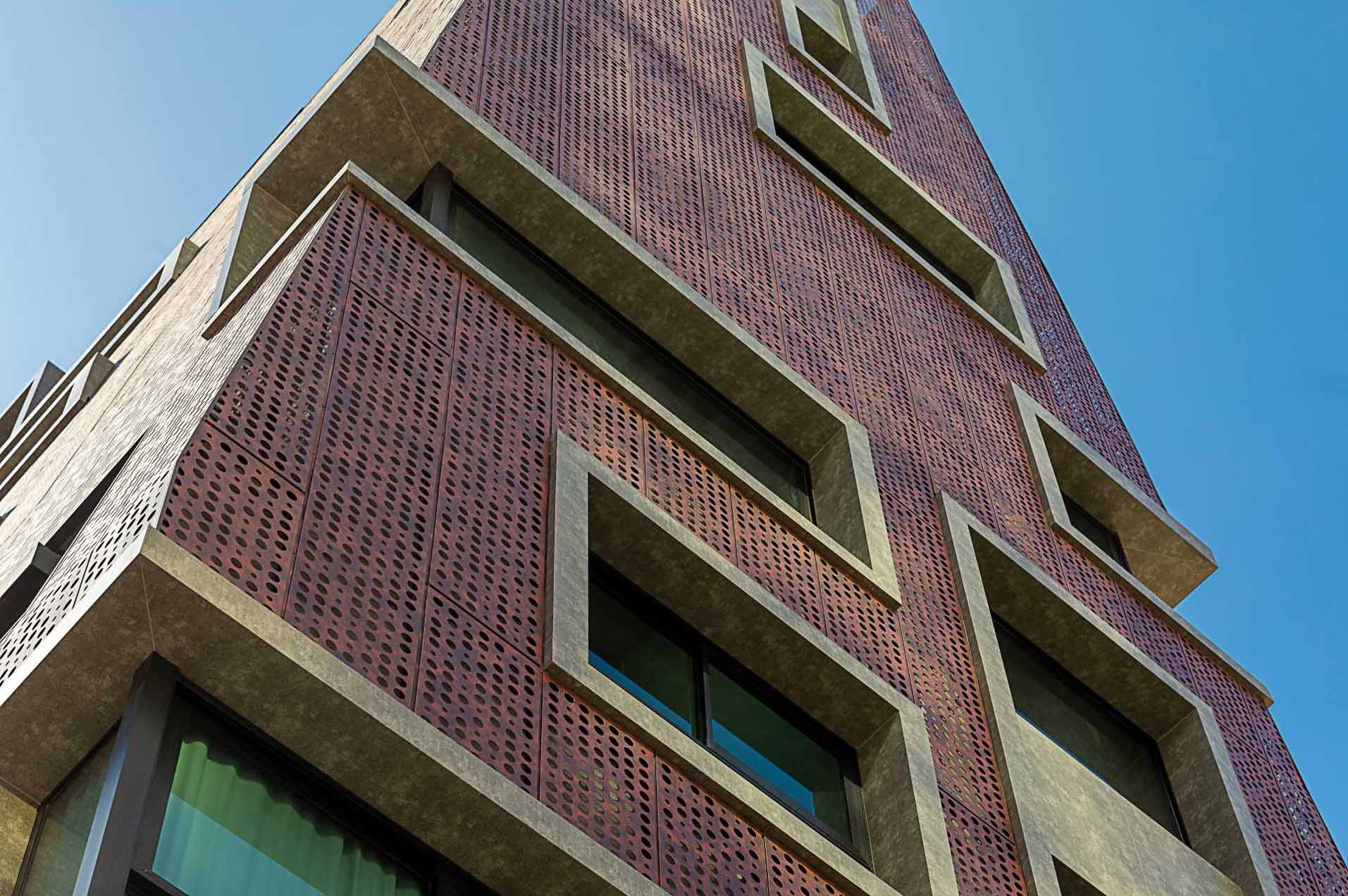 In order to obtain lightness and transparency for the bold building, the aluminum panels have perforations in different sizes, allowing the view of the surrounding area to be seen from within the building.