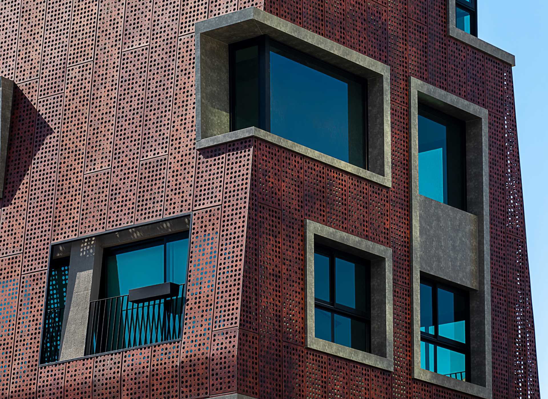 Contrasting the metal panels are concrete framed windows that are scattered throughout the building.