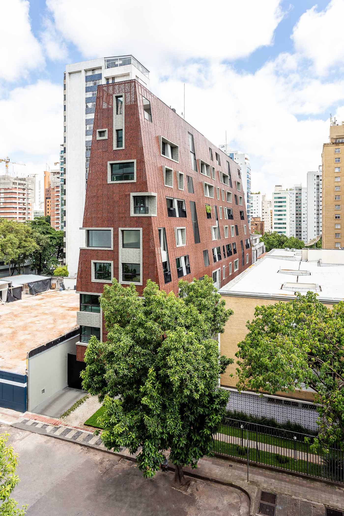 The facade that covers the building is made from aluminum panels, each painted in an earthy reddish sepia tone that alludes to the abundance in Minas Gerais of raw ore.