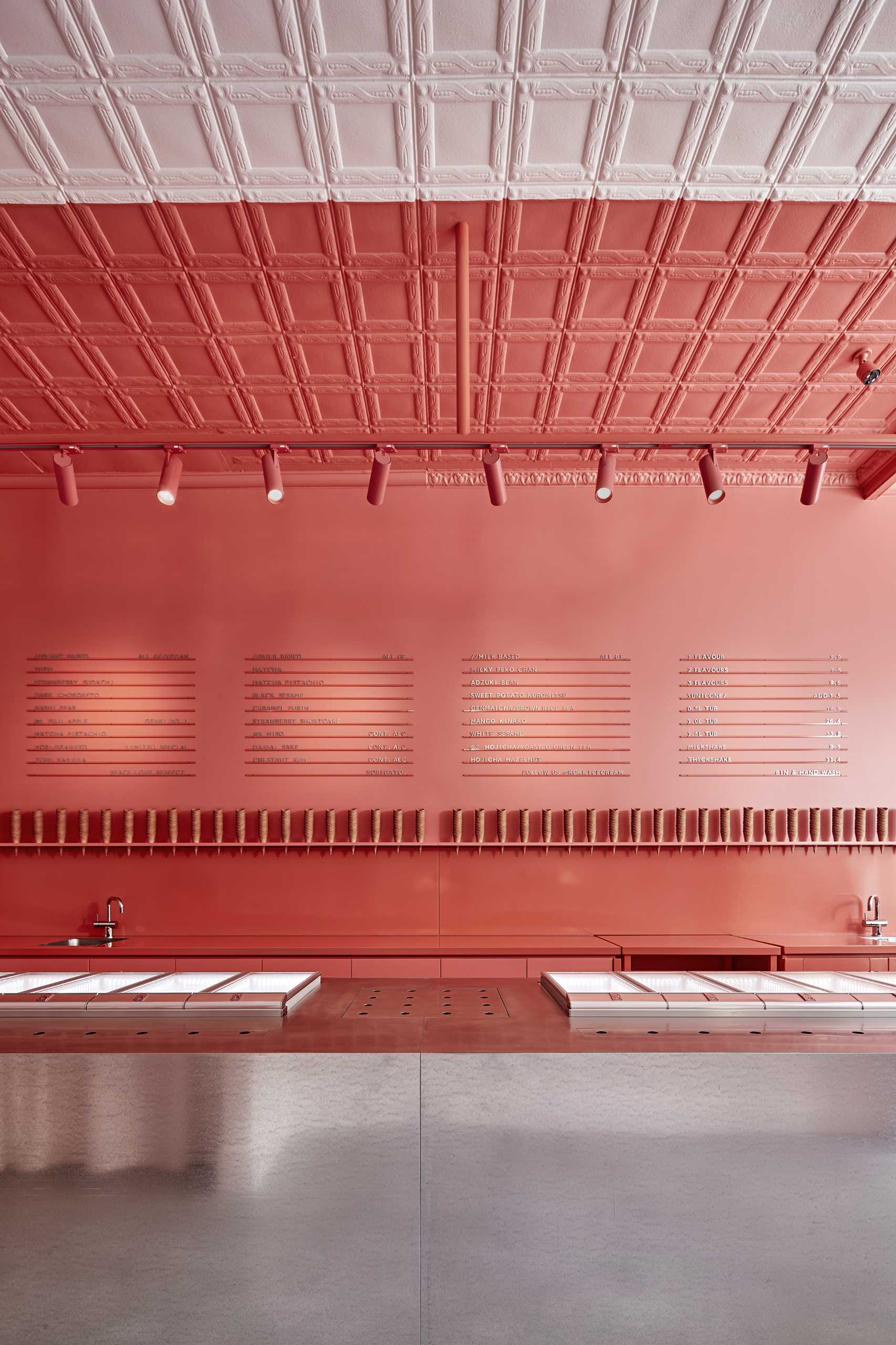 The pink back wall of the shop includes a workspace, ice cream cone storage, and a menu board.