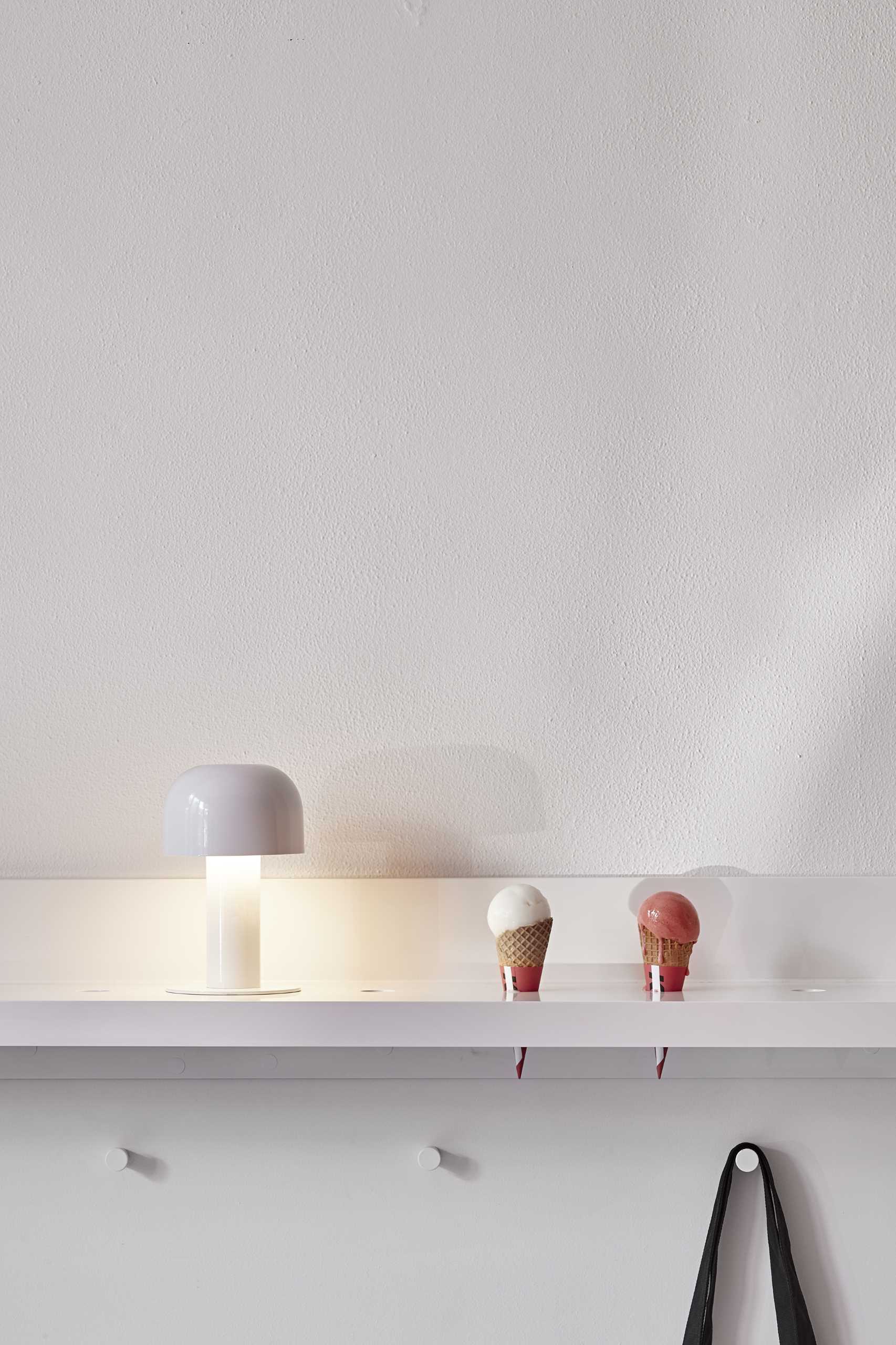 On the opposite white wall, there’s a shelf and a place for hanging bags and jackets.