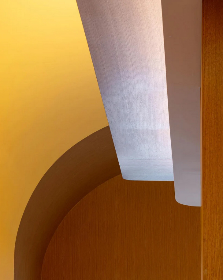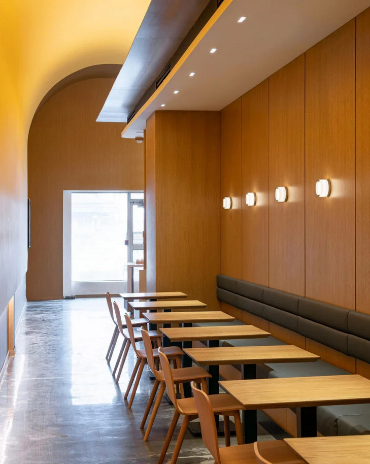 The arc mirrors what it might feel like to be inside a loaf of bread, only to be baked with lots of egg yolks. The brown shade is replaced with the purity of yolk yellow. Never mind what diners eat here. The bright-yellow interior and the Japanese aesthetics are already filling.