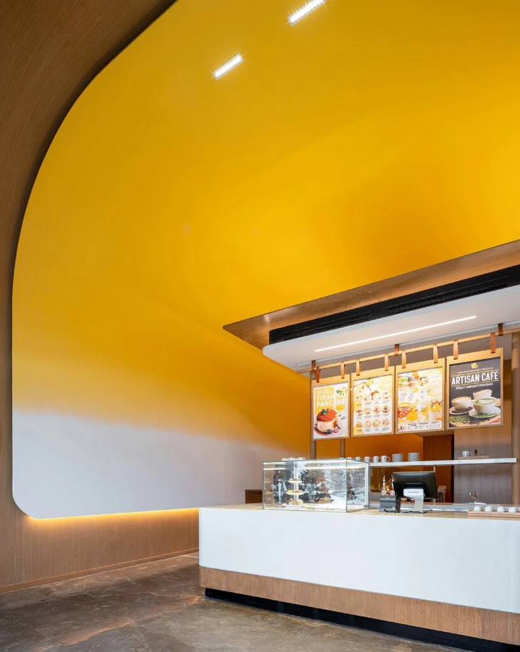 Studio Yimu wanted to introduce a modern café with a forward-looking presence as opposed to the traditional and subdued-toned counterparts in the neighborhood. To underline its zesty energy, the team painted the interior with the brightest yellow they could find to reverberate the coffee-and-cake culture of the youth and the steadfast quality of a classic eatery for those who seek repose immersed in guilt-filled dining.
