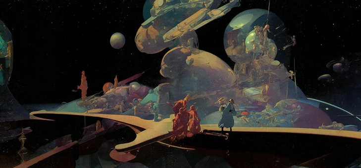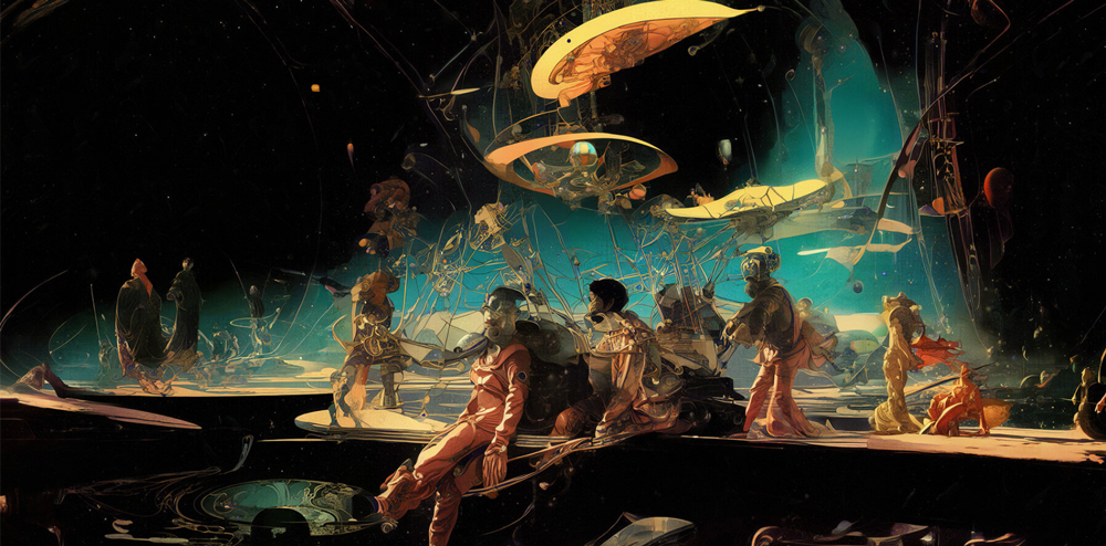 Using visual themes that have inspired the artist since youth – mythology, film, photography and comics, ‘S O M N I V M’ by Ganboord (b. 1968) uses AI as a tool to draw these references together. The artworks, titled ‘In this hard rock, while you do keep from me’ and ‘This island’s mine’, takes viewers on an exploration into pseudo-figurative and mind-altering effects like pareidolia, apophenia and synchronicity. Sci-if elements create cinematic universes where space adventures meet renaissance scenes.