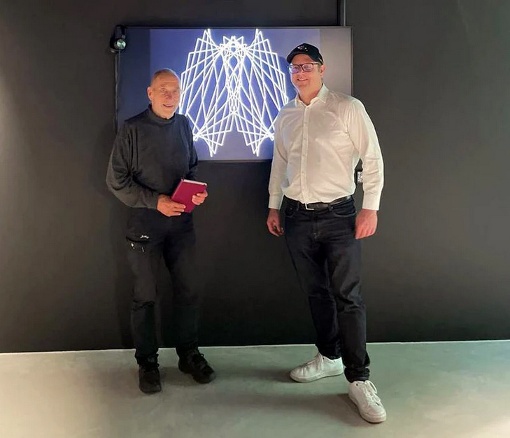 Frieder Nake and Georg Bak in front of Herbert W. Franke, at the Circle 18, Zurich Airport, Switzerland